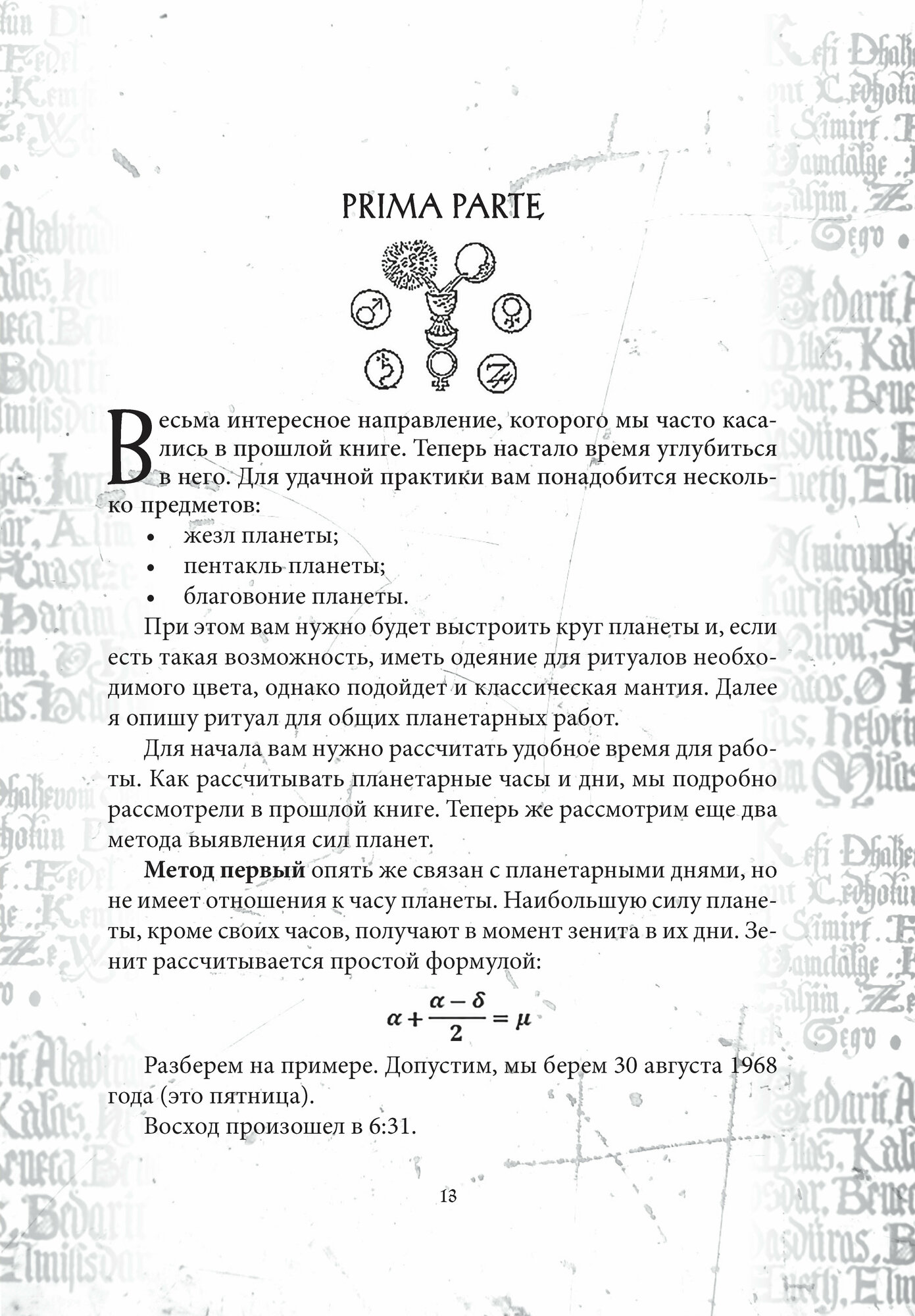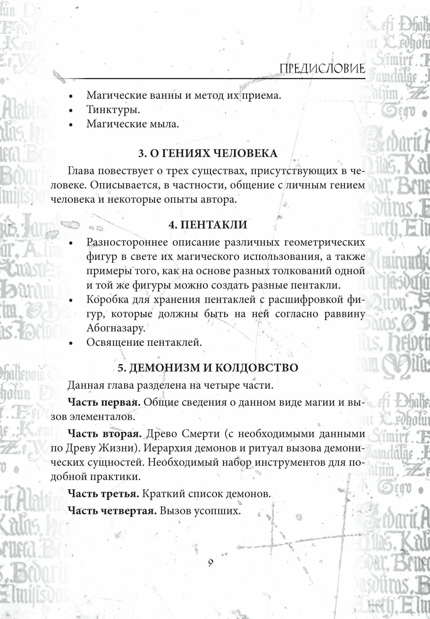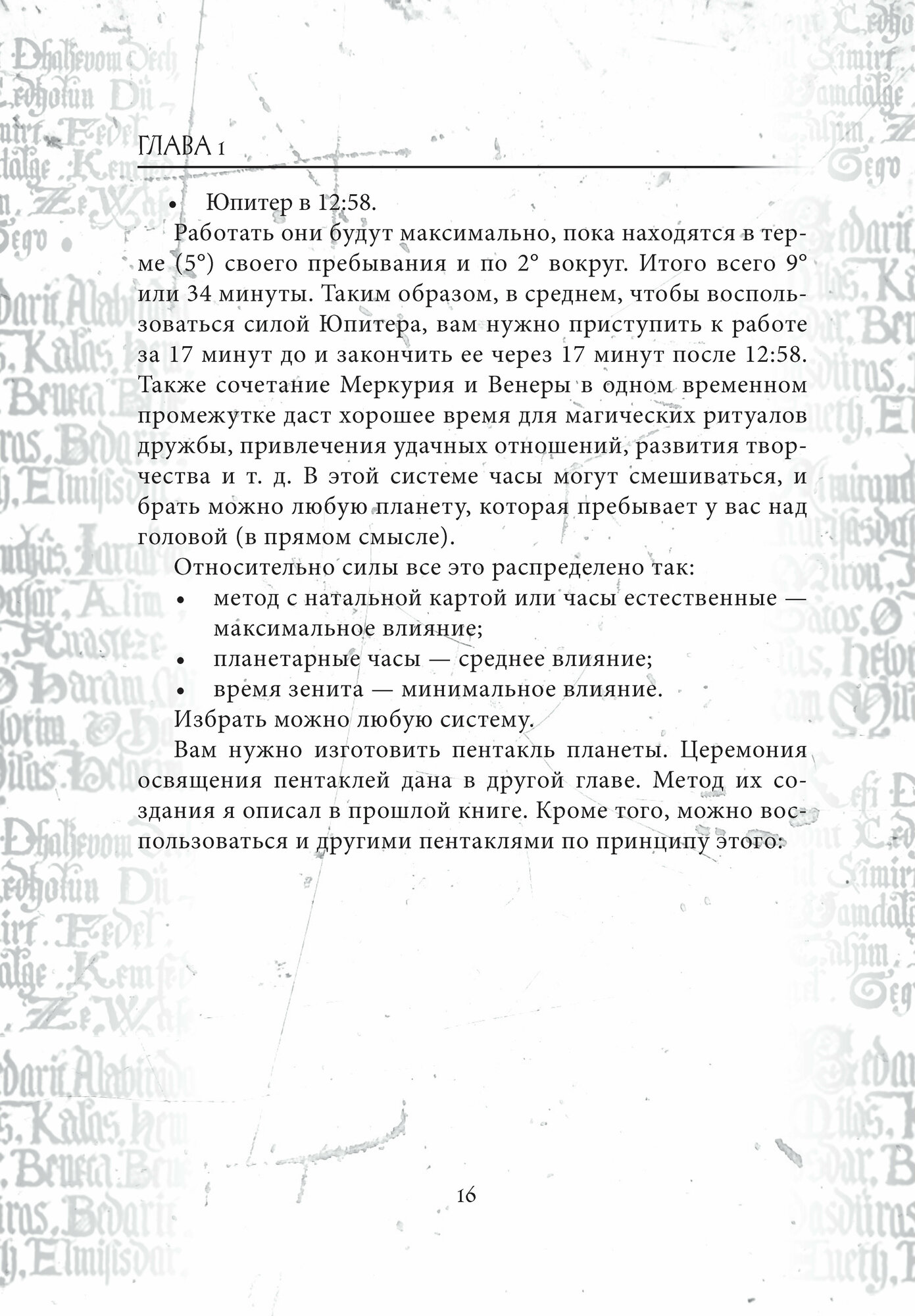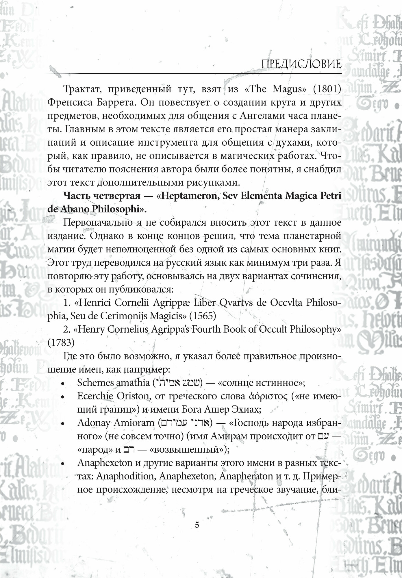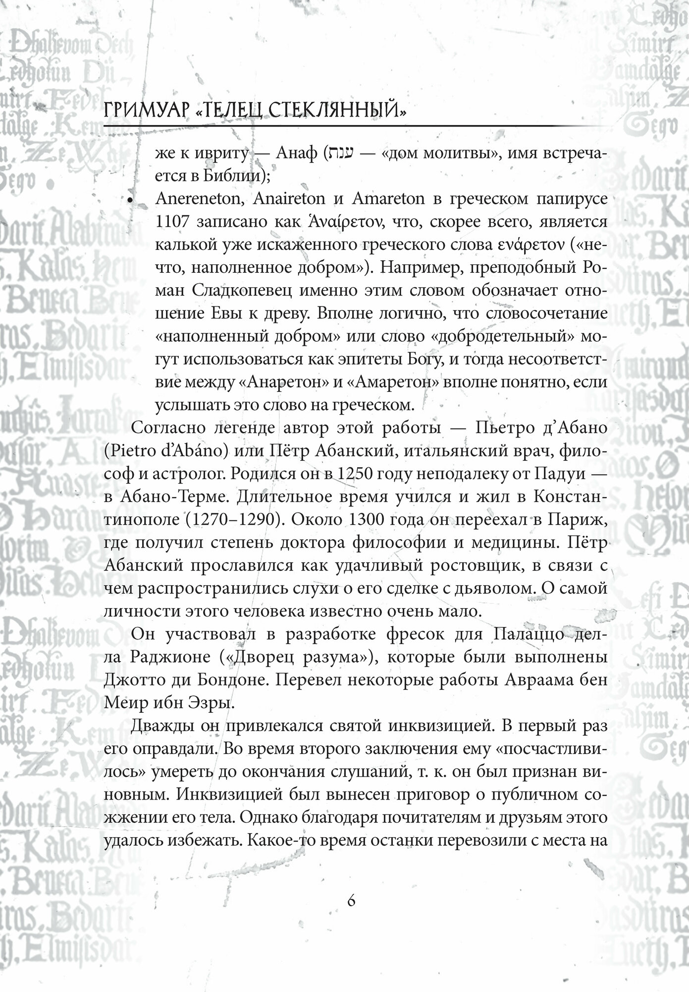 Перед вами обновленное издание легендарной книги-гримуара Ивана Бенгальского – «Гримуар Телец Стеклянный. Grimuar Vitulum Vitrum». Это издание содержит в себе обновленную и откорректированную информацию. Книга посвящена различным эзотерическим сведениям, в том числе взятым из неиздававшихся ранее гримуаров. Здесь – ценнейшая практическая информация по различным, наиболее популярным областям эзотерики: магии планетарной, природной, колдовствe, новые изображения пантаклей (пентаклей) для различных целей. В части, посвященной планетарной магии, вы найдете: ритуал призывания сил планетарных новые печати планет заклинания, специально приспособленные к планетарной магии. Основу главы составляют: ритуал создания кристалла и приготовления видений создание круга и инструментов список духов с печатями и заклинаниями пантакли знаков зодиака, подписи знаков зодиака имена ангелов, магический круг и вызов гения терма информация о гениях человека. Часть природной магии содержит: ритуалы вызова духов леса данные о магическом применении некоторых трав о создании магических чернил, свечей, благовоний и курений, амулетов из трав. В книге также содержится новая информация о пантаклях: описание разных геометрических фигур на основе их магического использования коробка для хранения пантаклей с расшифровкой фигур, которые должны быть на ней освящение пантаклей. В главе, посвященной колдовству, описаны способы вызова элементалей, древа смерти и жизни, иерархия демонов, ритуалы, инструменты. Итак, книга с полным правом может считаться отдельным и своеобразным пособием по эзотерике и магии. Издание может быть рекомендовано всем, кто интересуется названными областями эзотерики, желает получить по ним новую, более полную и раскрытую информацию. Кроме того, все, кто занимается практикой магии, могут попробовать приспособить указанные в книге сведения к своим ритуалам.