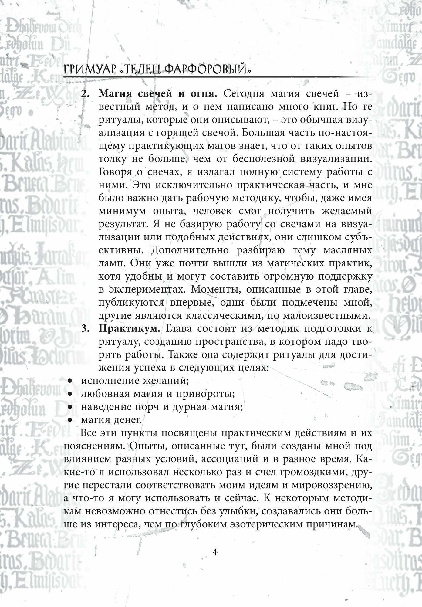 Перед вами третий переизданный том серии «Тельцов», который продолжает цикл Тельца Оловянного и Стеклянного. Многие вещи, которые в предыдущих книгах требовали разъяснений и уточнений, указаны именно здесь. Книга будет полезна как тем, кто приобрел предыдущие тома, так и для отдельного изучения. Что вы найдете здесь: В данной книге указан почти полный список того, как используется огонь в магии, в том числе давно забытые технологии. Рассказывается, как работать со свечами, причем не используя визуализацию, таким образом исключая самообман. Отдельно проработаны методы взаимодействия с духами леса и техники использования разнообразных растительных препаратов в магии. Увы, несмотря на то, что тема эта крайне популярна и о ней пишут многие, но традиционный взгляд обычно упускается, и дается некое личное виденье процесса. Вместе с этим для любой магической практики нужны инструменты: от банальных ножей до весьма экзотических предметов наподобие топоров-лабрисов. Тут подробно изложены методы создания инструментов. И наконец, глава о том, как приступить к магическому ритуалу, как подготовить себя и какие действия предпринимать, как и зачем делать круг и другие важнейшие аспекты практики. И самое главное – большой список ритуалов на разные цели, будь то любовь, привлечение денег, исполнение желаний или наведение порчи. Текст книги составлен на основании индивидуальных наработок за весьма большой срок, поэтому подходы и методы часто меняют философию, что дает возможность воспринимать материал разным по мироощущению людям.