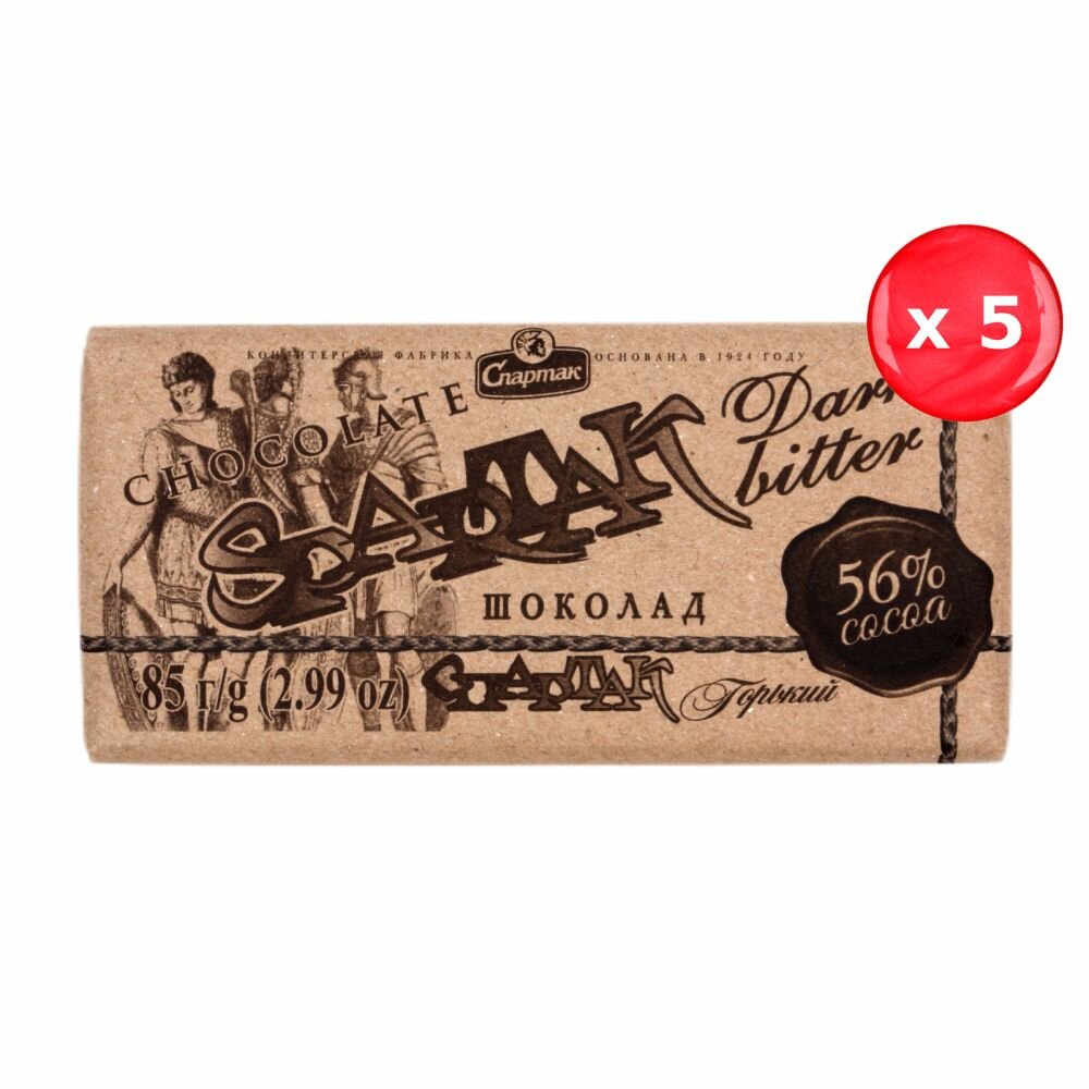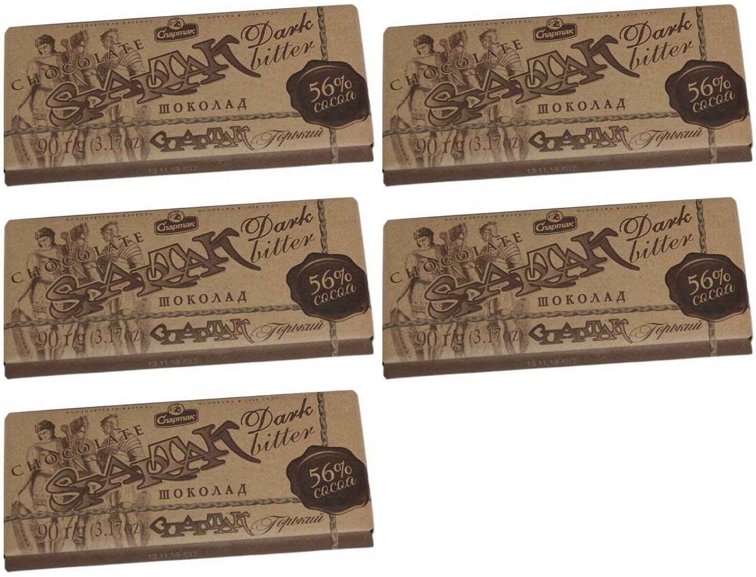 Горький шоколад Спартак с содержанием какао продуктов 56%. Настоящий белорусский шоколад, изготовлен из отборных какао-бобов по классической технологии на кондитерской фабрике СП "Спартак". Набор из 5 штук.