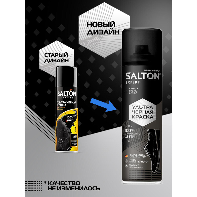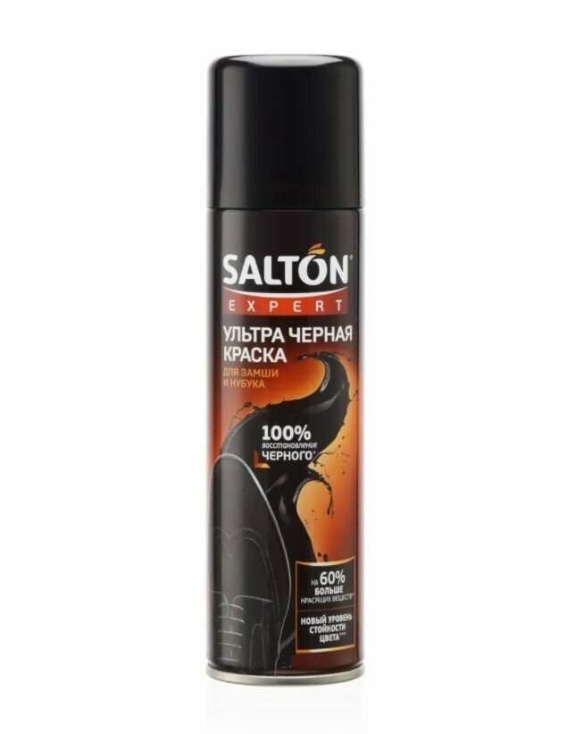 Если черная замшевая обувь сильно потерлась и полиняла, то не спешите ее выбрасывать. Ультра черная спрей-краска для замши Salton Expert быстро реанимирует Вашу обувь. Независимая лаборатория подтвердила, что краска для обуви из замши Salton Expert обладает наивысшей интенсивностью окрашивания среди других красок на рынке. Это средство для обуви содержит уникальную формулу с металлокомплексными красителями и повышенным содержанием черного красителя, что позволяет ей легко возвращать обуви 100% насыщенный и устойчивый к выцветанию черный цвет, эффективно маскируя потертости. Краска для замшевой обуви Salton Expert с цветом ультра черный полностью восстанавливает цвет черной обуви, одежды и аксессуаров из замши и нубука. Краска Salton Expert помогает вернуть глубокий черный цвет замшевых изделий и надолго сохранить его ярким.