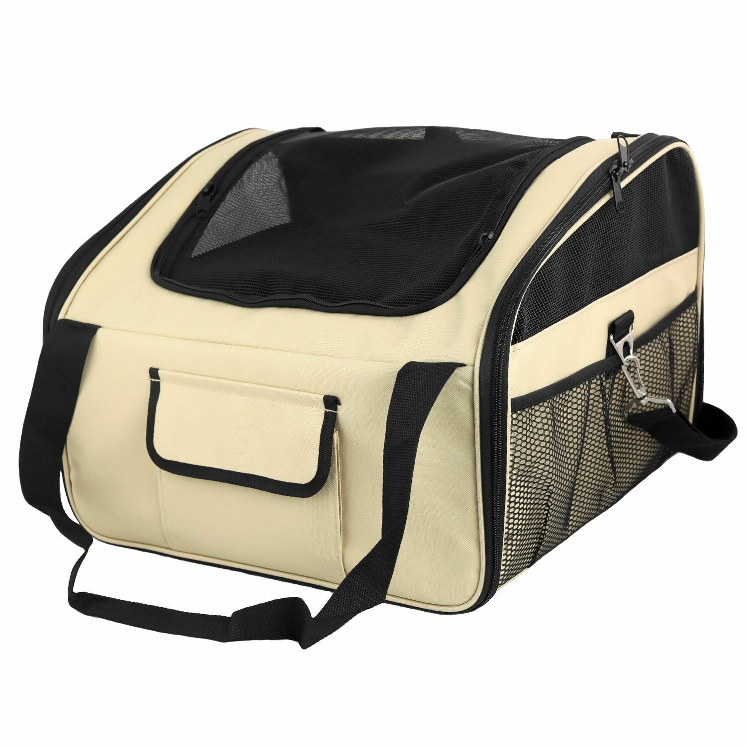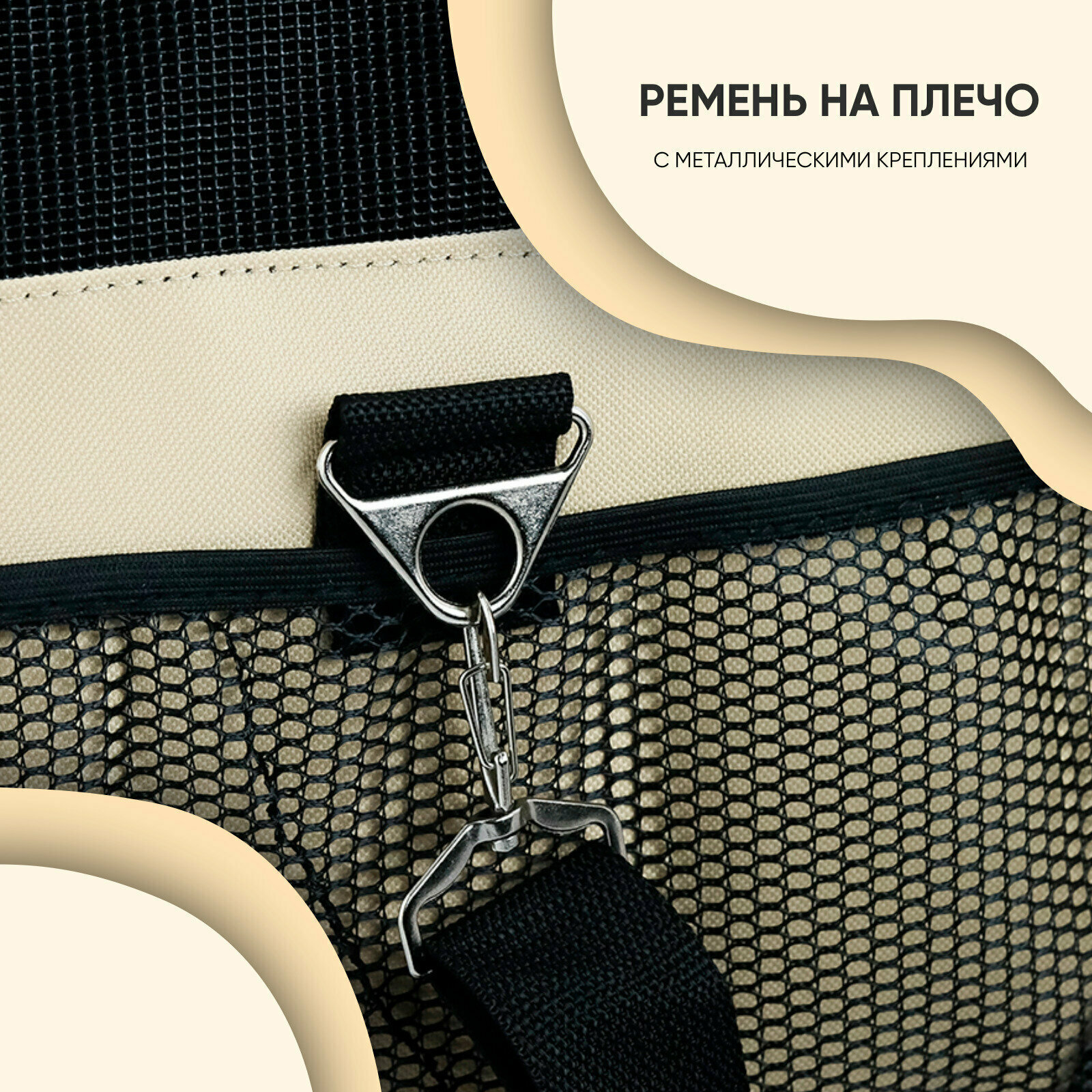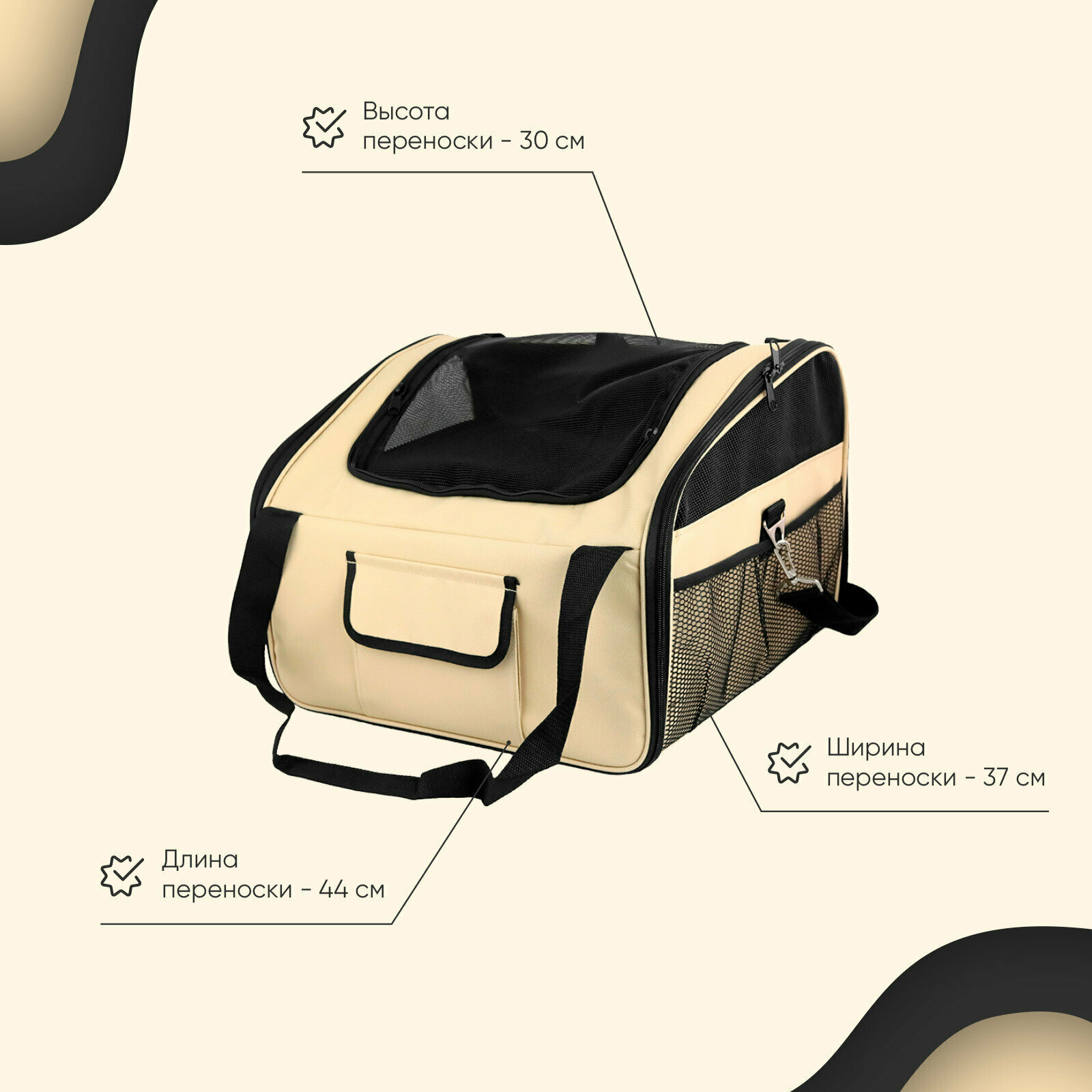Сумка-переноска для животного на ремне. Сумка оснащена прочными ручками по бокам изделия и ручкой-ремнем на плечо, двумя боковыми и одним закрытым карманами на лицевой части изделия, одним верхним и двумя боковыми хорошо проветриваемыми клапанами-сетками, которые обеспечат питомцу комфортное пребывание внутри переноски. Ткань изделия устойчива к царапинам. Внутри изделия прикреплен карабин для удерживания животного внутри переноски. Размер изделия - 44х37х30 см. Размер дна - 39,5х35 см.