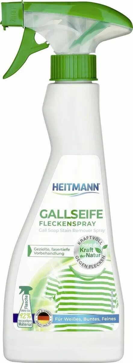 HEITMANN Пятновыводитель на основе желчного мыла с тригером Аэрозольный пятновыводитель с желчным мылом Heitmann Fleckenspray mit Gallseife Идеально подходит для цветного белья, шерсти и шелка. Благодаря мягкому воздействию желчного мыла удаляет пятна и загрязнения со всех пригодных для стирки и деликатных тканей. В рецептуре скомбинирована растворяющая способность натуральной желчи с очищающей способностью тензидов на базе возобновляемого растительного сырья. PH соответствует мягко-кислотному раствору. Не содержит отбеливающих веществ.