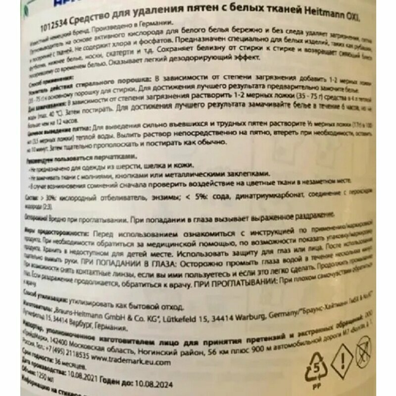 На сегодняшний день товар «Средство для удаления пятен Heitmann OXI Power Weiss с белых тканей 500г Brauns-Heitmann GmbH» можно купить с кешбеком в 1 магазине: Яндекс.Маркет