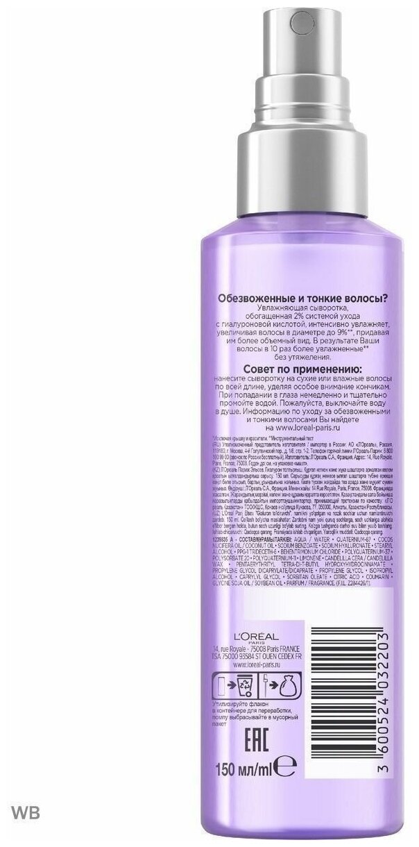 У вас обезвоженные и тонкие волосы? Увлажняющая сыворотка, обогащенная 2% системой ухода с гиалуроновой кислотой интенсивно увлажняет, увеличивая волосы в диаметре до 9%, придавая им более объемный вид. В результате ваши волосы в 10 раз более увлажненные, без утяжеления.