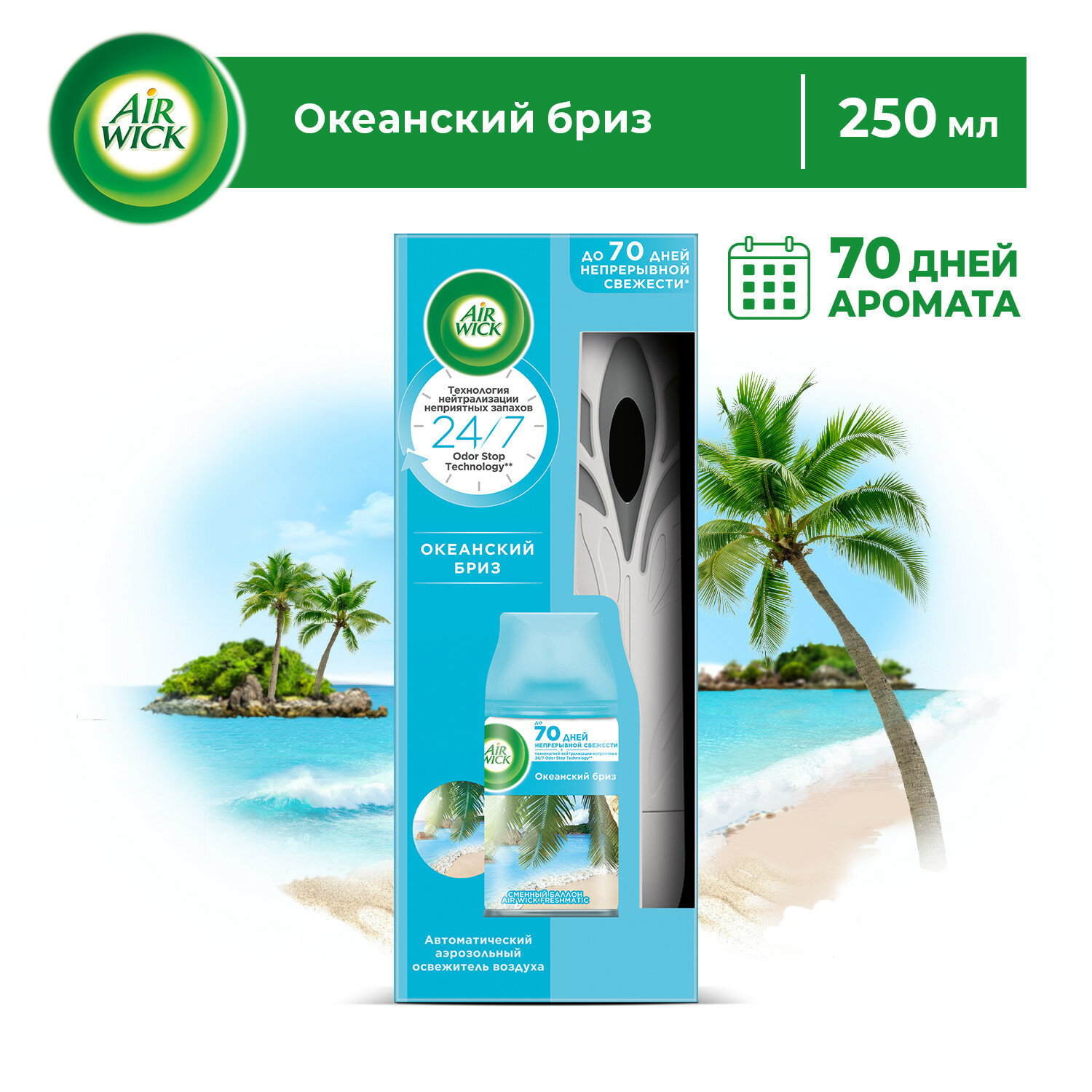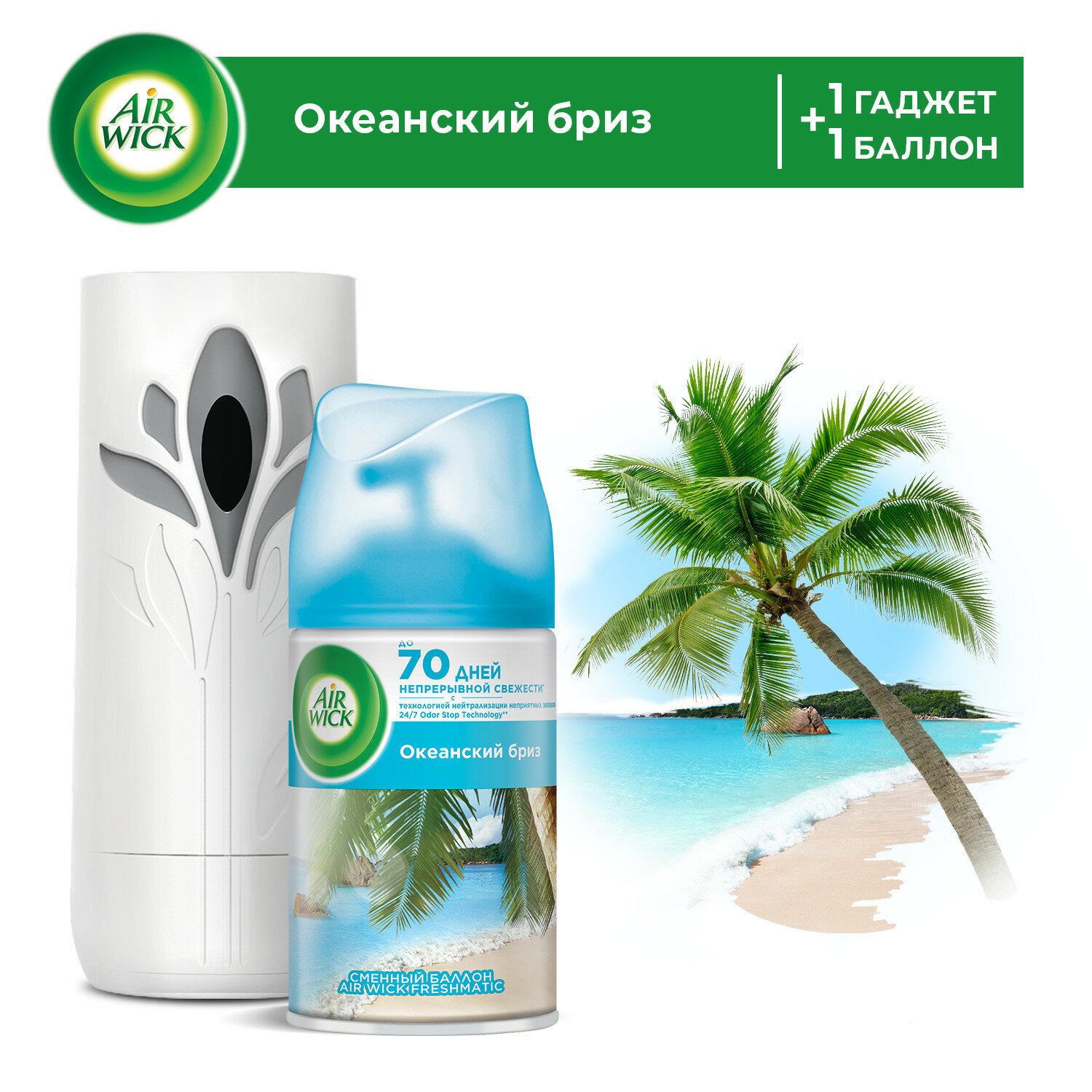 Автоматический освежитель воздуха Air Wick Freshmatic это небольшое стильное устройство, которое автоматически борется с неприятными запахами день за днём. Аромат "Океанский бриз" наполнит Ваш дом изысканными нотками морской волны. Вставьте сменный баллон в элегантное устройство, выберите интенсивность распыления и наслаждайтесь утонченным ароматом Air Wick, разработанным парфюмерными домами Европы**. До 70 дней непрерывной свежести* Удобно вешать на стену, размещать на полке или ставить на шкаф. Нормальное функционирование автоматического распылителя гарантировано при использовании сменного баллона Air Wick Freshmatic. Состав набора: - Автоматический распылитель воздуха - Сменный баллон "Океанский бриз" - 1 батарейка АА - Регулирумеые режимы интенсивности распыления аромата *При использовании на минимальных настройках распыления, согласно отчету ASC-236 от 06.12.2019г. АрЭндДи Рекитт Бенкизер, г.Халл, Великобритания **В состав продукта входит аромат, разработанный одним из парфюмерных домов Европы, согласно письма АрЭндДи ЭйрКэа Рекитт Бенкизер, г. Халл, Великобритания от 06/06/2019