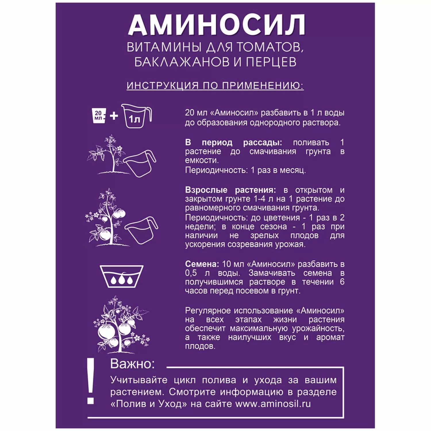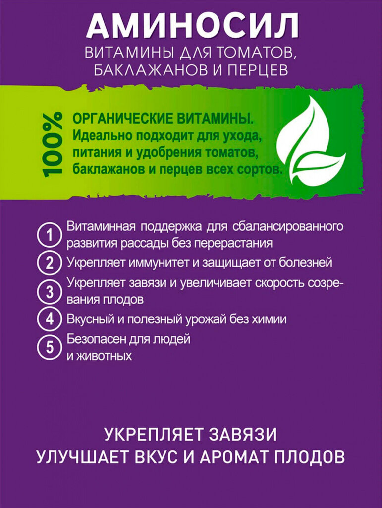Аминосил - абсолютная новинка! Полный комплекс витаминов. 100% органический состав. Идеально подходит для ухода, питания и удобрения томатов, баклажанов и перцев всех сортов. Витаминная поддержка для сбалансированного развития рассады без перерастания. Укрепляет иммунитет и защищает от болезней. Укрепляет завязи и увеличивает скорость созревания плодов. Вкусный и полезный урожай без химии! Безопасен для людей и животных. Регулярное использование “Аминосил” на всех этапах жизни растения обеспечит максимальную урожайность, а также наилучших вкус и аромат плодов. Макро и микроэлементы: Азот - 1,5%; Фосфор - 2%; Калий -2,3%; Магний - 0,21%; Железо - 0,02%; Кальций - 0,55%; Марганец - 0,002%; Цинк - 0,001%; Медь - 0,0001%. 40+ аминокислот.