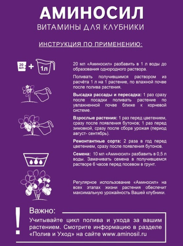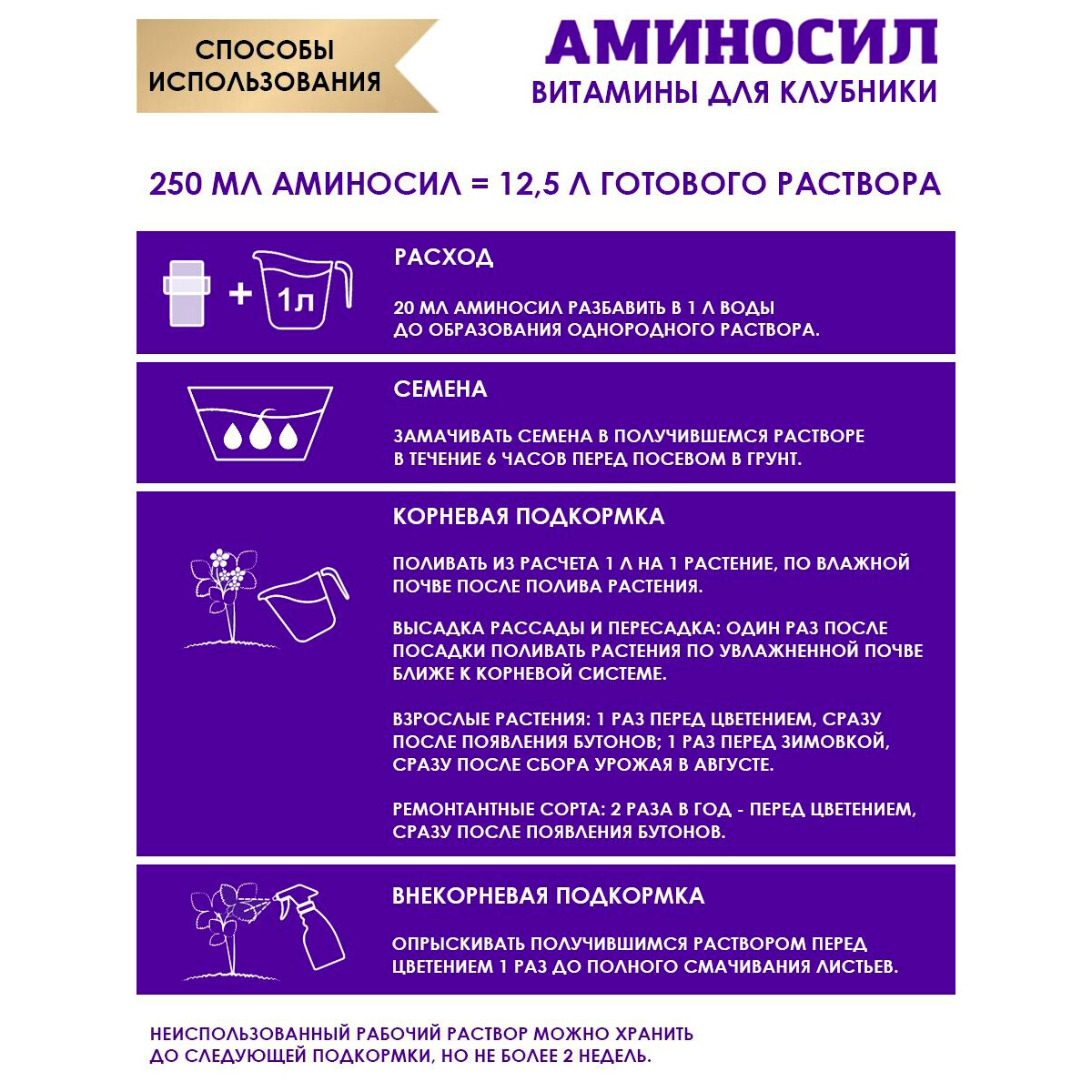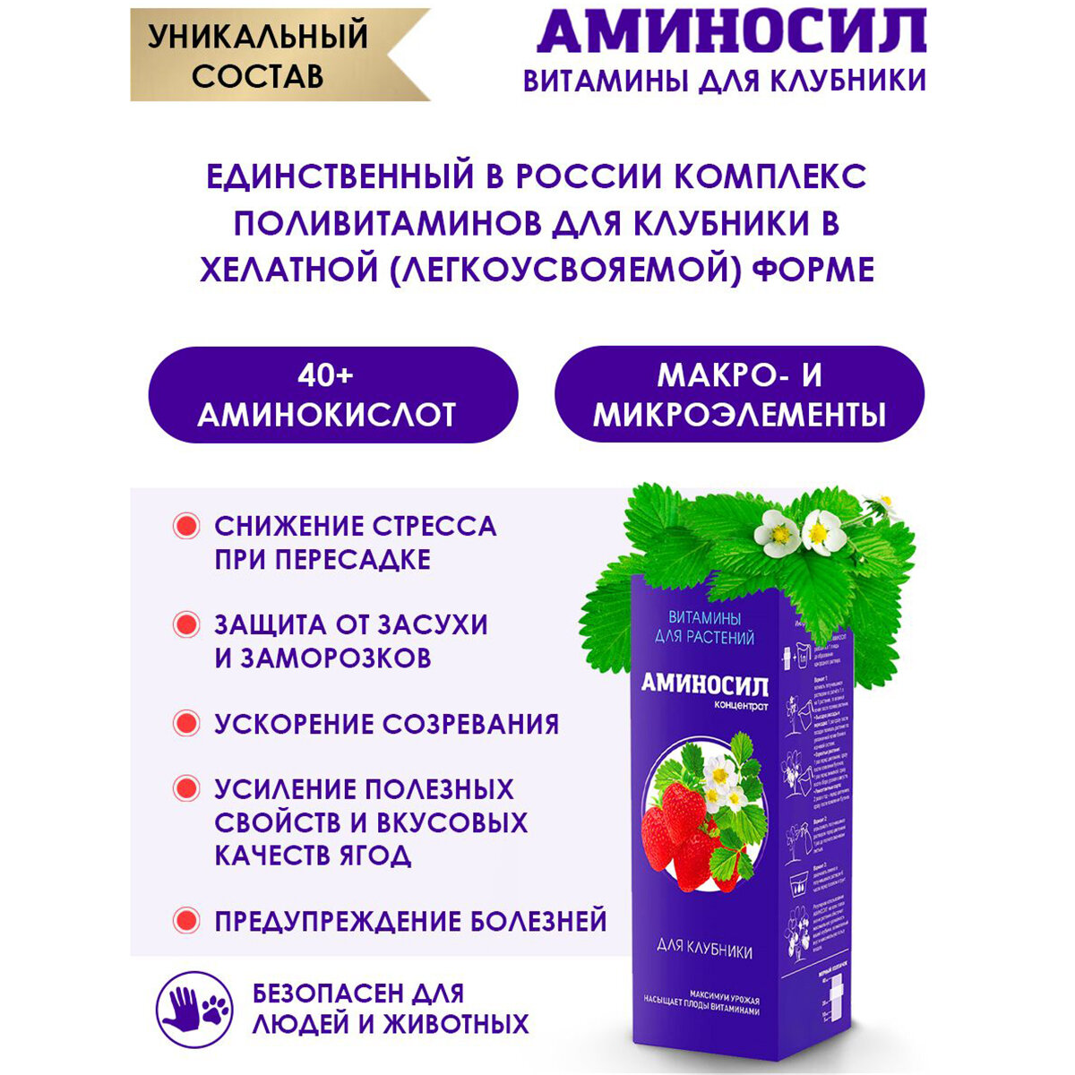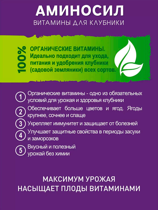 Витамины для клубники Аминосил идеально подходят для ухода, питания и удобрения клубники (садовой земляники) всех сортов. 1. Органические витамины - одно из обязательных условий для урожая и здоровья клубники. 2. Обеспечивает больше цветов и ягод. Ягоды крупнее, сочнее и слаще. 3. Укрепляет иммунитет и защищает от болезней. 4. Улучшает защитные свойства в периоды засухи и заморозков. 5. Вкусный и полезный урожай без химии! 100% органический состав. Макро и микроэлементы. 40+ аминокислот. Расход: 20 мл разбавить в 1 л воды до образования однородного раствора. Подкормка – это удобрение, которое предназначено для обеспечения растения питательными веществами. Для клубники или земляники, это является особенно важным. Эти ягодные культуры требуют особого ухода, и нужно обеспечить их всем необходимым. Удобрения для клубники и земляники содержат в себе микроэлементы, которые необходимы для здоровья растений и урожайности. Благодаря использованию таких удобрений, саженцы будут расти быстрее и лучше плодоносить. Подходящее удобрение поможет создать условия для здорового роста растений, а также способствует формированию качественного урожая. Если вы хотите получать богатый и вкусный урожай ягод, то нужно использовать соответствующие удобрения. Создайте условия для здоровья ваших растений и получите прекрасный урожай.