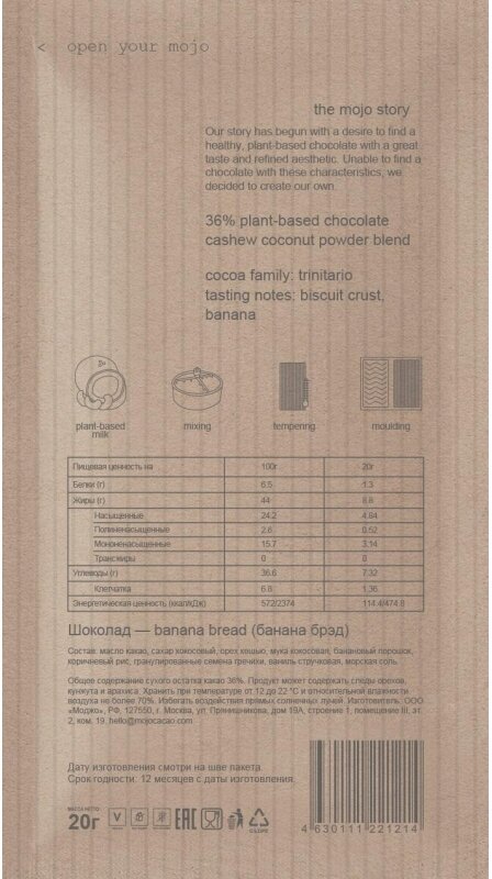 Шоколад Mojo Cacao Banana Bread 36% 20г Моджо