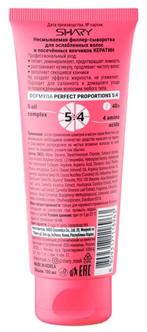 | Состав | Water, Glycerin, Steartrimonium Chloride, Cetearyl Alcohol, Cetyl Alcohol, Butylene Glycol, 1,2-Hexanediol, Hydrolyzed Keratin, Hydrolyzed Silk, Hydrolyzed Collagen, Arginine, Aspartic Acid, Glutamic Acid, Proline, Prunus Amygdalus Dulcis (Sweet Almond) Oil, Argania Spinosa Kernel Oil, Camellia Japonica Seed Oil, Cocos Nucifera (Coconut) Oil, Helianthus Annuus (Sunflower) Seed Oil, Glyceryl Stearate, PEG-100 Stearate, Aloe Barbadensis Leaf Juice, Centella Asiatica Extract, Houttuynia Cordata Extract, Perilla Frutescens Leaf Extract, Camellia Sinensis Leaf Extract, Fragrance, Citronellol, Geraniol, Hexyl Cinnamal, Butylphenyl Methylpropional, Limonene, Linalool, Alpha-Isomethyl Ionone, Ethylhexylglycerin, Disodium EDTA |