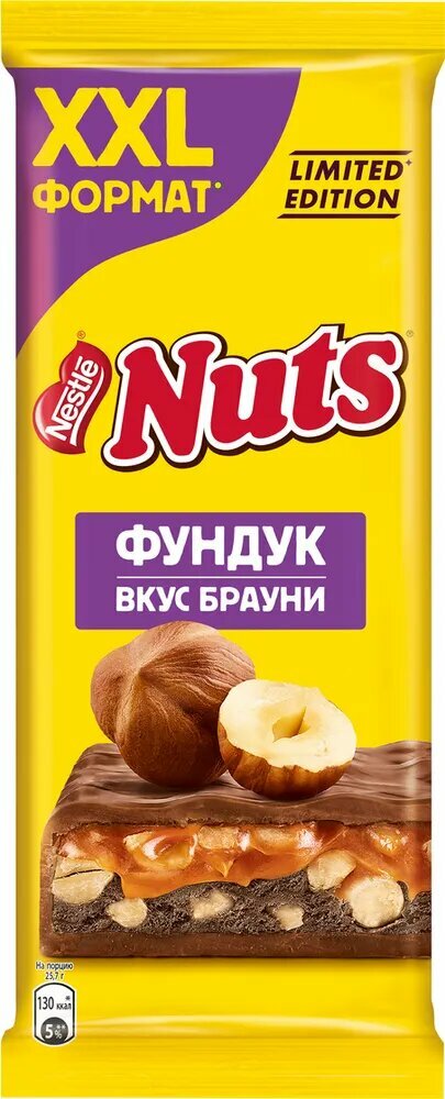 Новое прочтение вкуса шоколадного батончика Nuts теперь в виде шоколадной плиты ХXL Формата! Ограниченная серия шоколадной плиты Nuts со вкусом Брауни - это молочный шоколад, обжаренный дробленый фундук, тягучая мягкая карамель и нежная шоколадная нуга со вкусом Брауни! Nuts всегда радует своим крутым вкусом и помогает подзарядить мозги , ведь фундук ценится за большое содержание магния и кальция, стимулирующих мозговую активность. Nuts отлично подходит в качестве быстрого перекуса между приемами пищи для себя или чтобы поделиться в компании друзей.