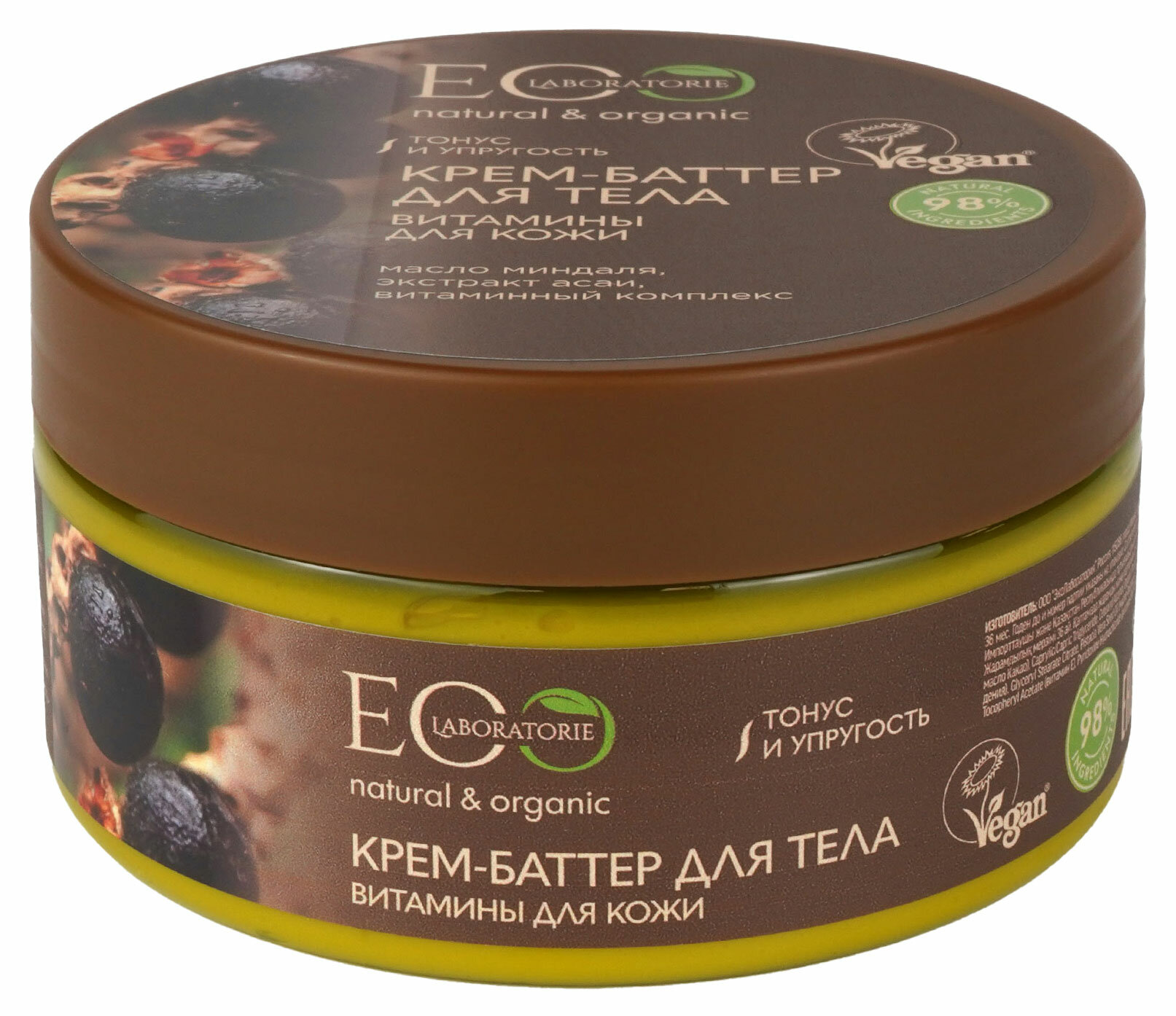 Крем-баттер для тела EO Laboratorie® Витамины для кожи, благодаря активным ингредиентам в составе, глубоко питает кожу, повышает ее эластичность, замедляет процесс старения. При регулярном использовании кожа нежная, бархатистая при прикосновении. Активные ингредиенты: масло миндаля способствует хорошему увлажнению и смягчению кожи, устраняет сухость и шелушение, освежает и тонизирует кожу. Экстракт ягод асаи помогает разрушать свободные радикалы, защищает от вредного воздействия окружающей среды и настраивает клетки кожи на регенерацию, улучшает тургор кожи. Витаминный комплекс тонизирует и оздоравливает кожу.
