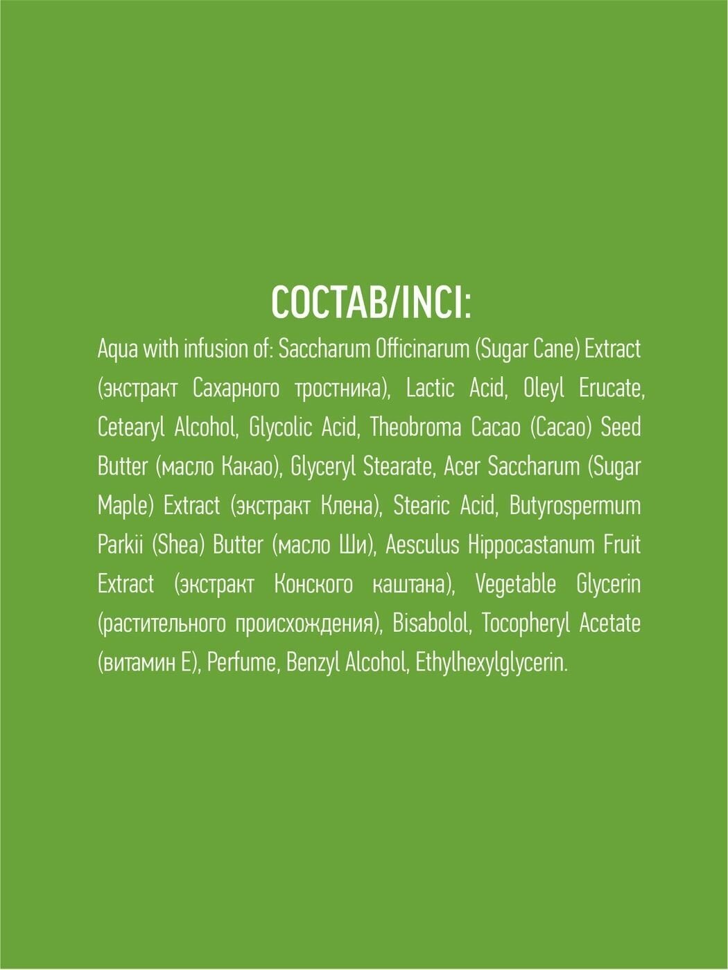 | Химический состав | Aqua, Glycerin (растительного происхождения), Elaeis Guineensis Oil (масло пальмы), Stearic Acid, Saccharum Officinarum Extract (экстракт сахарного тростника), Cetearyl Alcohol, Olea Europaea Fruit Oil (оливковое масло), Glyceryl Stearate, Prunus Amygdalus Dulcis Oil (масло сладкого миндаля), Butyrospermum Parkii Butter (масло ши), Ethylhexyl Stearate, Acer Saccharum Extract. |