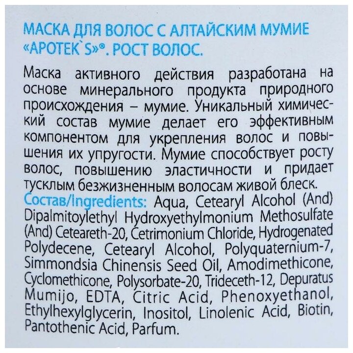 | Состав | Aqua, Cetearyl Alcohol (And) Dipalmitoylethyl Hydroxyethylmonium Methosulfate (And) Ceteareth-20 , Cetrimonium Chloride, Hydrogenated Polydecene, Cetearyl Alcohol, Polyquaternium-7, Simmondsia Chinensis Seed Oil, Amodimethicone, Cyclomethicone, Polysorbate-20, Trideceth-12, Depuratus Mumijo, EDTA, Citric Acid, Phenoxyethanol, Ethylhexylglycerin, Inositol, Linolenic Acid, Biotin, Pantothenic Acid, Parfum |