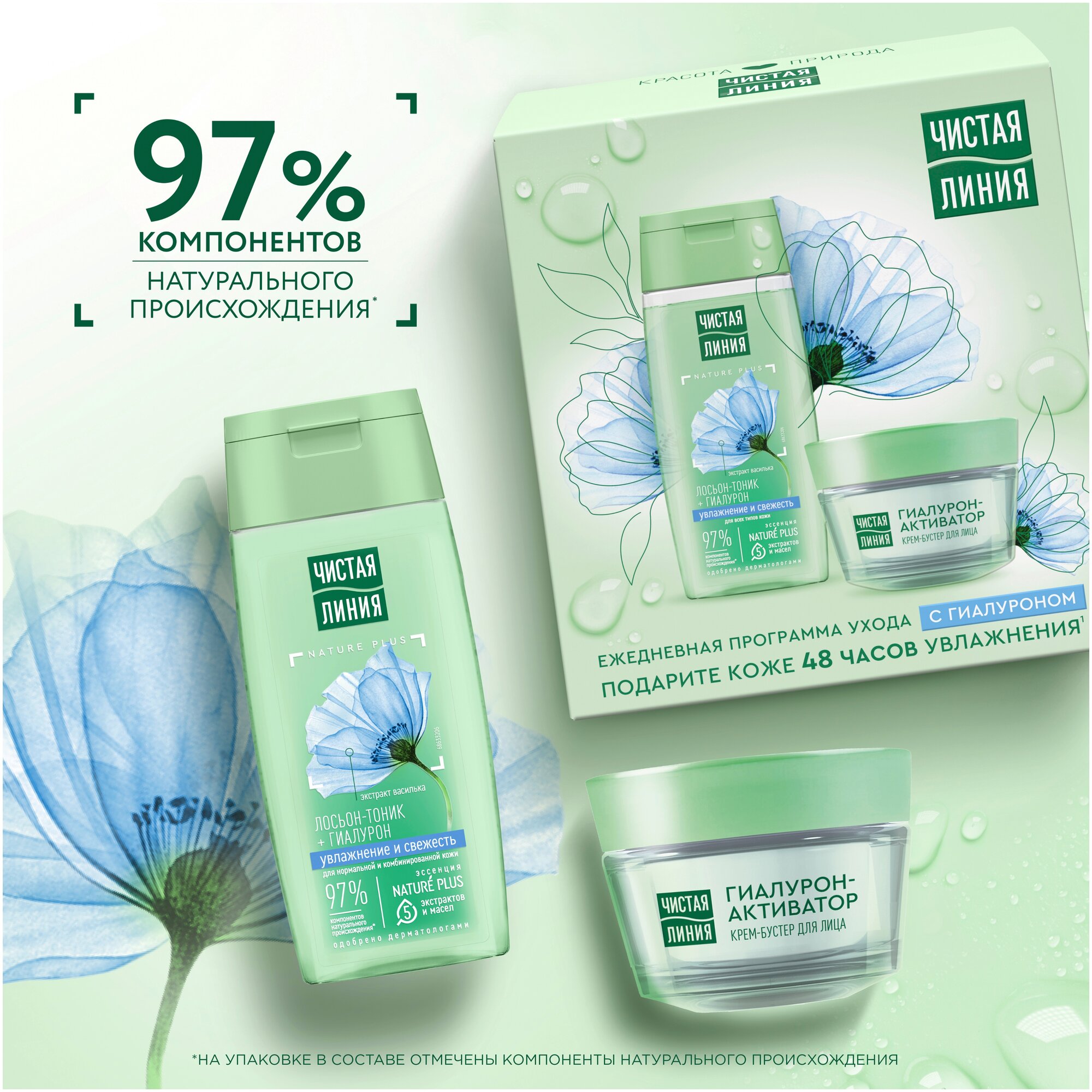 Грамотный комплексный уход за кожей – один из лучших подарков, который не останется без внимания. Ежедневная программа ухода с растительным гиалурон-активатором от бренда Чистая Линия стимулирует синтез собственной гиалуроновой кислоты и поддерживает естественный процесс увлажнения кожи.Лосьон-тоник с экстрактом василька и гиалуроном на 97% состоит из компонентов натурального происхождения* и подходит для всех типов кожи. В состав лосьон-тоника входит эссенция из пяти экстрактов и масел NATURE PLUS (экстракт вербены, экстракт пиона, масла миндаля, льна, оливы), экстракт василька и гиалурон.- Экстракт вербены восстанавливает баланс увлажненности и тонизирует.- Экстракт пиона и льняное масло успокаивают и смягчают.- Масло миндаля содержит жирные кислоты, витамины Е и F, питает и выравнивает поверхность кожи.- Масло оливы богато природными антиоксидантами, питает и защищает от преждевременного старения кожи.- Гиалурон насыщает кожу влагой и препятствует ее чрезмерному испарению.- Экстракт василька тонизирует кожу и восстанавливает ее эластичность.Результат: естественно красивая, увлажненная и сияющая кожа.Сразу после лосьон-тоника нанесите крем-бустер Чистая Линия. Он содержит 97% компонентов натурального происхождения* и дарит коже 48 часов увлажнения1. Эссенция из пяти экстрактов и масел Nature Plus (экстракт вербены, экстракт пиона, масла миндаля, льна, оливы) и экстракт василька питают, восстанавливают липидный барьер, наполняют влагой, смягчают и выравнивают микрорельеф.2% активного гиалурон-геля реализуют многовекторную стратегию увлажнения кожи. Низкомолекулярная гиалуроновая кислота проникает в глубокие слои кожи', а высокомолекулярный гиалуронат натрия мгновенно увлажняет кожу. На поверхности кожи образуется невидимая вуаль, которая выравнивает микрорельеф и препятствует испарению влаги. Активный гиалурон-гель усилен растительным гиалурон-активатором, который стимулирует синтез собственной гиалуроновой кислоты и поддерживает естественный процесс увлажнения кожи. Благодаря такому комплексному воздействию кожа вновь увлажненная и мягкая.*компоненты натурального происхождения отмечены в составе на упаковке.['] в пределах эпидермиса.[1] подтверждено клинически: после 10 дней использования крема-бустера эффект увлажненности сохраняется в течение 48ч, 28 респондентов, РФ, 2022.