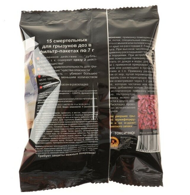 «СуперМОР — зерно» — средство против мышей, полевок, а также серых крыс.Упаковка/штрих-код «СуперМОР — зерно»: пакет 105 г1. Каждый брикет (7 г) упакован в фильтр-пакет 2. Усиленное действие — «дубль-эффект», так как содержит сразу 2 действующих вещества! 3. Высокая привлекательность для грызунов, снижение «чувства опасности».4. Экономичность — убивает большее число грызунов меньшим количеством приманки. 5. Удобен и безопасен в раскладке.Упаковка/штрих-код «СуперМОР — зерновая приманка»: 4607043201393 — пакет 42 г (6 смертельных доз в фильтр-пакетах по 7 г) 4607043206893 — пакет 105 г (15 смертельных доз в фильтр-пакетах по 7 г)Состав: бинарная смесь ДВ антикоагулянтов 1-го и 2-го поколений: дифенацин — 0,012%, бромадиолон — 0,0025%, функциональные добавки, пищевая основа.Применение: приманку помещают на подложки, лотки, специальные емкости по 1 — 2 пакетика от мышей или полевок и по 2 — 3 пакетика от крыс на расстоянии 2 — 5 метров друг от друга. При высокой численности грызунов приманку раскладывают чаще, но меньшими порциями. При истреблении грызунов вне помещений приманку необходимо защитить от дождя и воды, для этого подложки с приманкой прикрывают сверху от осадков или размещают в пустых трубах, укрытиях и т. п. Приманку раскладывают вблизи от нор, путей перемещения грызунов, вдоль стен и перегородок. Места раскладки осматривают через 1 — 2 дня. К приманке, которая частично или полностью съедена, добавляют новую. Загрязненную или испорченную приманку меняют на новую. Нетронутую приманку можно перенести в другое место. Раскладку проводят до исчезновения грызунов.Меры предосторожности: применять в местах, недоступных для детей и домашних животных, отдельно от пищевых продуктов. При раскладке не принимать пищу, не пить и не курить, работать в перчатках. По окончании работ руки тщательно вымыть теплой водой с мылом. Не выбрасывать остатки приманки в мусорные ящики и водоёмы! При случайном проглатывании возможно отравление (признаки: слабость, тошнота, головная боль). Пострадавшему немедленно выпить несколько стаканов воды и вызвать рвоту механическим раздражением задней стенки глотки. Затем принять активированный уголь (на 1 стакан воды 10 — 15 измельченных таблеток). При попадании на кожу — тщательно промыть водой с мылом. При попадании в глаза — обильно промыть их водой или 2% раствором пищевой соды. Пострадавшего показать врачу. Антидот витамин К3 (викасол) или К1 (фитоменадион), препараты на их основе, под наблюдением врача.Хранить в упаковке производителя, в сухих прохладных помещениях, в местах, не доступных для детей и домашних животных, отдельно от пищевых продуктов и кормов, лекарственных средств, а также химических веществ, имеющих запах. Требует защиты кожных покровов!Срок годности: 3 года в нераспечатанной упаковке производителя.