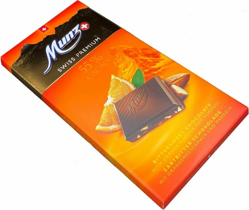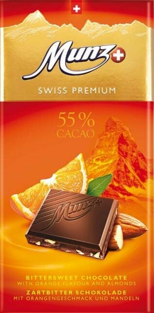 Munz Swiss Premium dark 55% orange/almonds. Освежающий темный шоколад с лучшим какао Арриба из Эквадора. Легкое фруктовое сочетание темного шоколада с оттенком апельсина и хрустящей миндальной крошки придает батончику мечтательные горьковато-сладкие нотки.