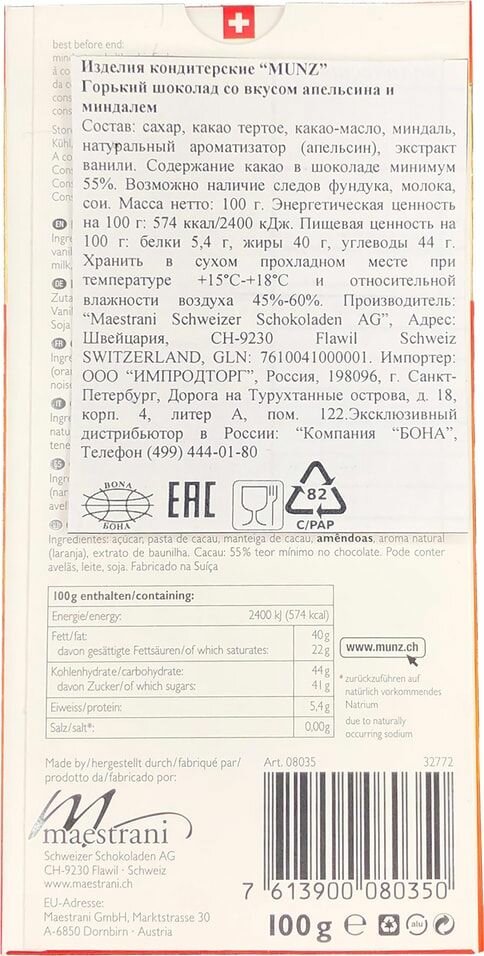 Сервис сравнения цен СкидкаГИД предлагает сравнить цены на товар «Шоколад Munz Горький с миндалем и апельсином 100г Maestrani Schweizer Schokoladen»