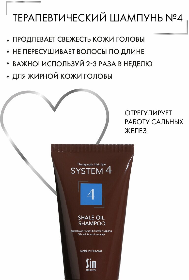 Шампунь № 4 подходит для жирной и чувствительной кожи головы. Продукт стабилизирует работу сальных желез, оказывает выраженное противовоспалительное действие. Шампунь №4 не рекомендуется использовать шампунь чаще, чем 3-4 раза в неделю. Рекомендуется чередовать с шампунем №1.