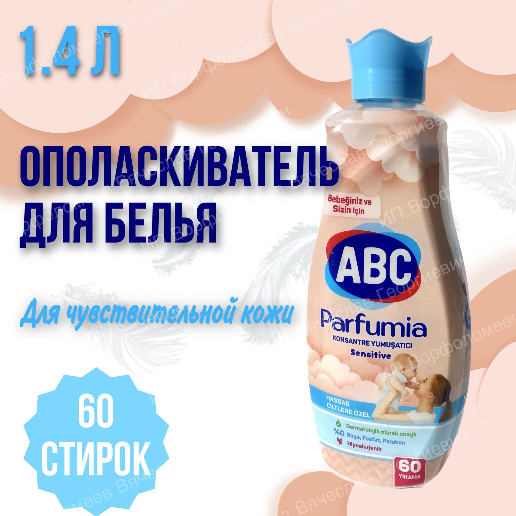 Концентрированный парфюмированный кондиционер-ополаскиватель от компании ABC Parfumia для чувствительной кожи - 1440 мл. Гипоаллергенный продукт. Оригинальное качество из Турции. Добавьте небольшое количество средства в отделение стиральной машинки для полоскания, чтобы ваше белье восхитительно благоухало, благодаря богатой формуле и технологии волшебных парфюмерных капсул! Придает белью мягкость, облегчает глажку и придает антистатический эффект. Белье наполнено свежестью и надолго сохраняет аромат нежного цветка. Продукты ABC экологически безопасны. Турецкий производитель бытовой химии ABC это популярный бренд в разных уголках мира, предлагающий отличное качество по доступной цене. Способ применения: при автоматической стирке добавить 50-60 мл в отделение для кондиционера, при ручной стирке добавить в воду при последнем полоскании. Особые инструкции: Храните в недоступном для детей месте! Не держите рядом с продуктами питания! Не используйте для мойки рук, лица, тела и продуктов питания. Избегать попадания в глаза. При попадании в глаза немедленно промойте их большим количеством воды и обратитесь к врачу. ABC - бытовая химия - лучшее решение для чистоты Вашего дома! Бытовая химия для стирки ABC Производство Турция. Внешний вид товара может отличаться в зависимости от партии.