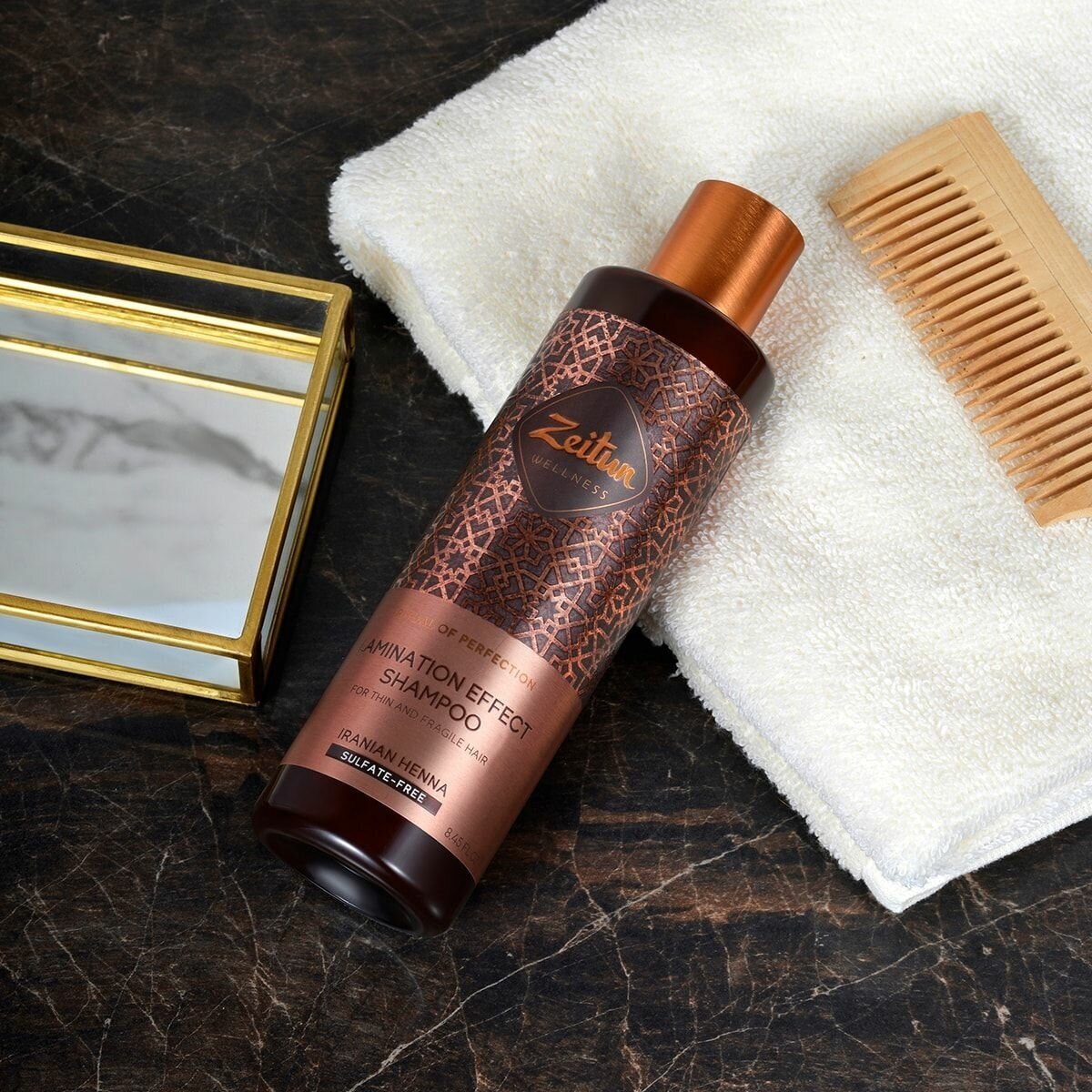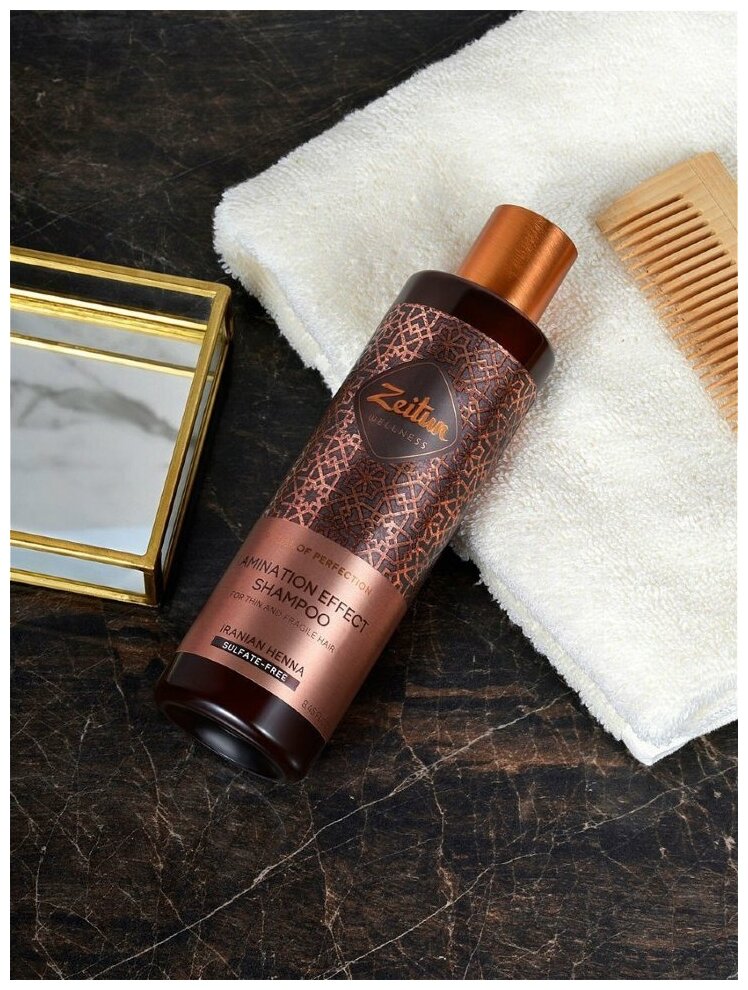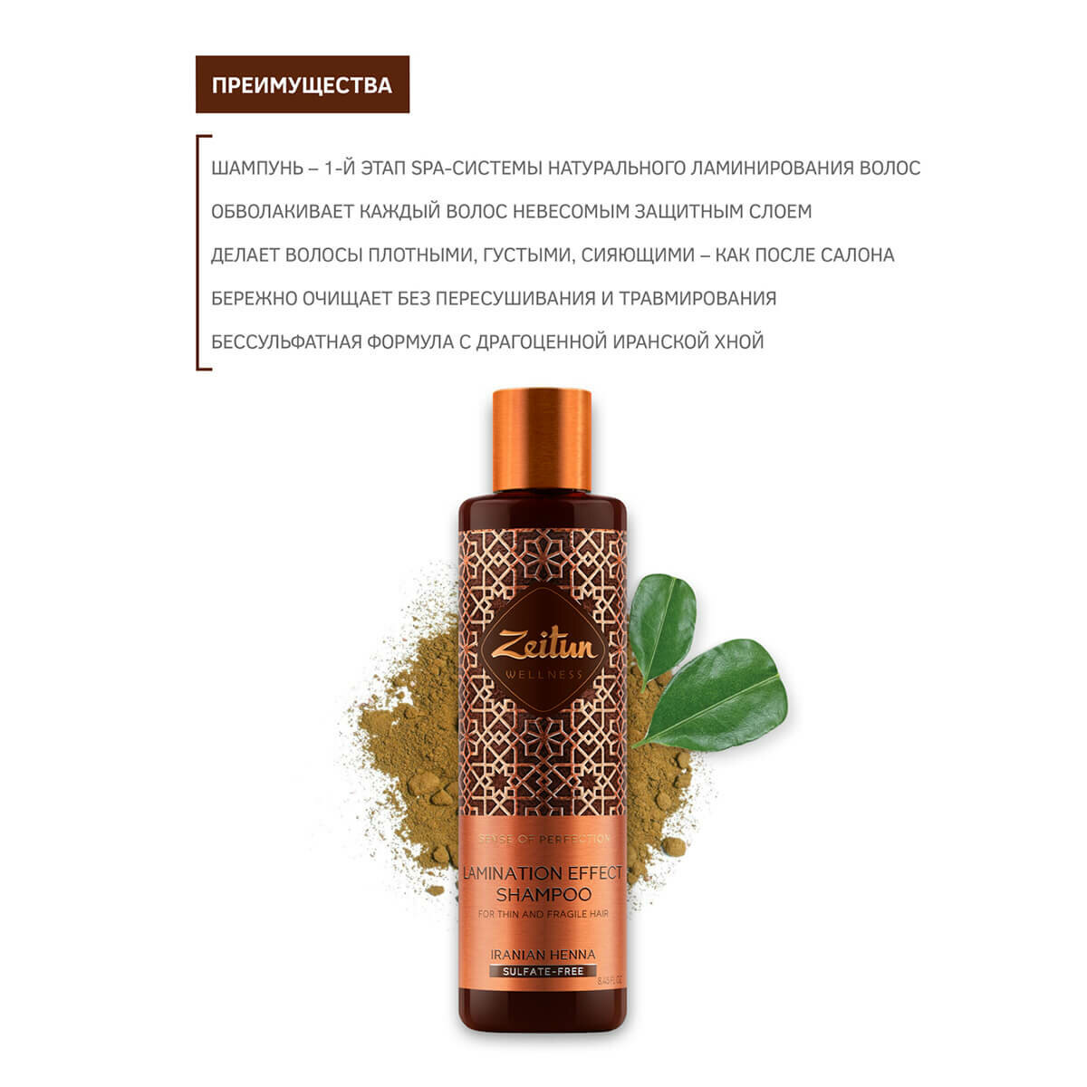 Подарите Вашим волосам эффект профессионального салонного ламинирования с бессульфатным шампунем Zeitun “Ритуал Совершенства”. Легендарная натуральная формула шампуня с драгоценной Иранской Хной объединяет эффективность традиционных компонентов и инновационных технологий в области ухода за волосами. Шампунь – первый этап ежедневной процедуры ламинирования у вас дома: средство бережно очищает волосы и скальп от загрязнений – без спутывания и пересушивания, состав обволакивает каждый волос невесомым защитным слоем, разглаживает, уплотняет, усиливает объем и блеск волос. Мягкая моющая основа без SLS/SLES эффективно очищает и образует привычную пену, при этом не травмирует и не спутывает волосы при мытье. Способ применения: нанести на влажные волосы, вспенить и смыть.