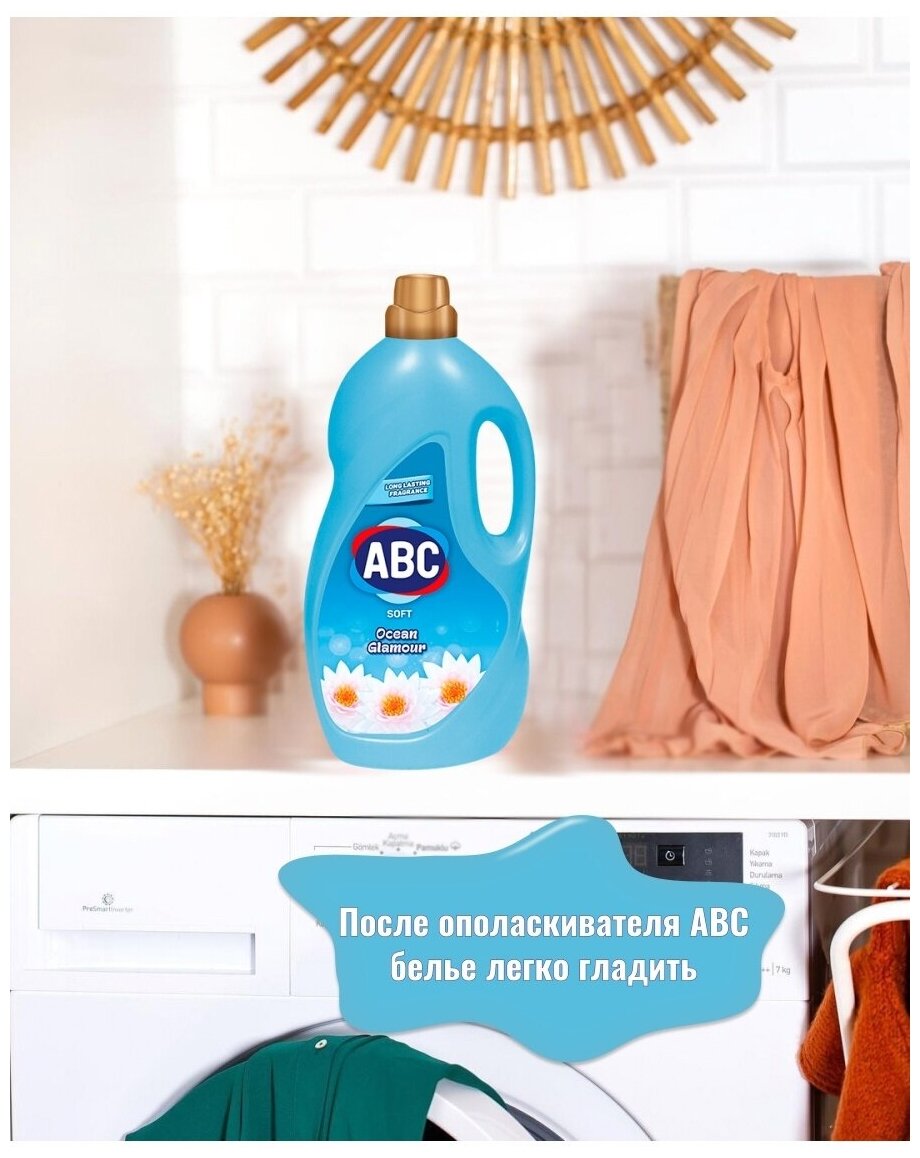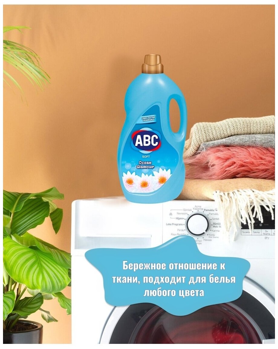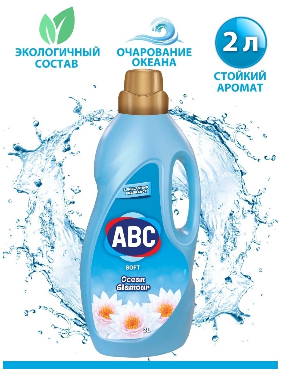Смягчитель для белья ABC Очарование океана. Смягчитель для белья Марки АВС, выполняет функции кондиционера для стирки белья, применяются при стирке в качестве дополнительного средства. Он добавляется в воду при последнем полоскании, что делает стирку более качественной, а белье более мягким. Кондиционер придает белью антистатические свойства и приятный запах, делает его цвет более стойким и облегчает последующее глажение