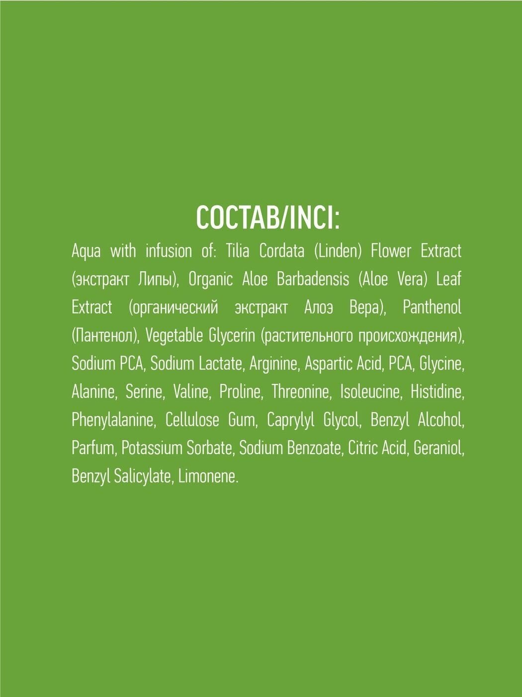| Химический состав | Aqua with infusion of: Tilia Cordata (Linden) Flower Extract (экстракт Липы), Organic Aloe Barbadensis (Aloe Vera) Leaf Extract (органический экстракт Алоэ Вера), Panthenol (Пантенол), Vegetable Glycerin (растительного происхождения), Sodium PCA, Sodium Lactate, Arginine, Aspartic Acid, PCA, Glycine, Alanine, Serine, Valine, Proline, Threonine, Isoleucine, Histidine, Phenylalanine, Cellulose Gum, Caprylyl Glycol, Benzyl Alcohol, Parfum, Potassium Sorbate, Sodium Benzoate, Citric Acid, Geraniol, Benzyl Salicylate, Limonene. |