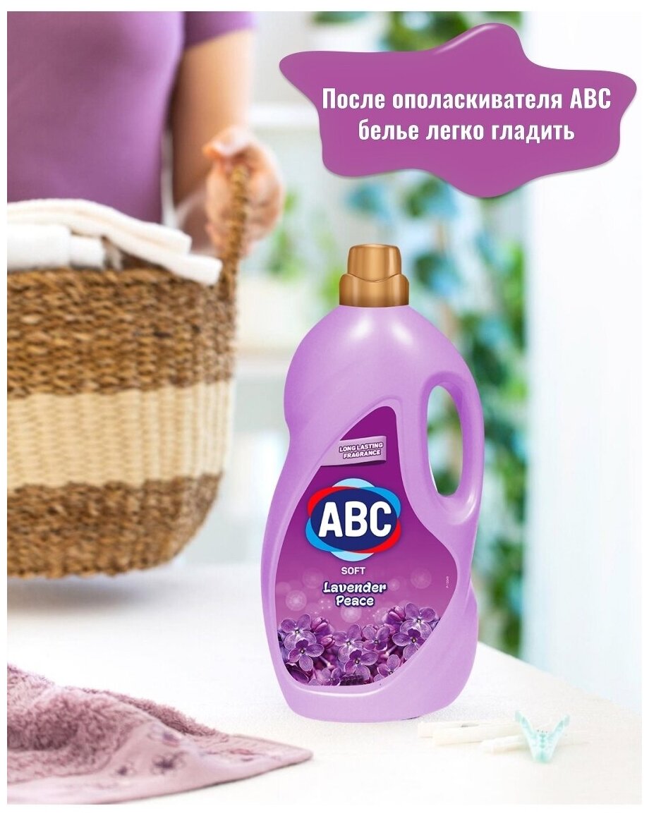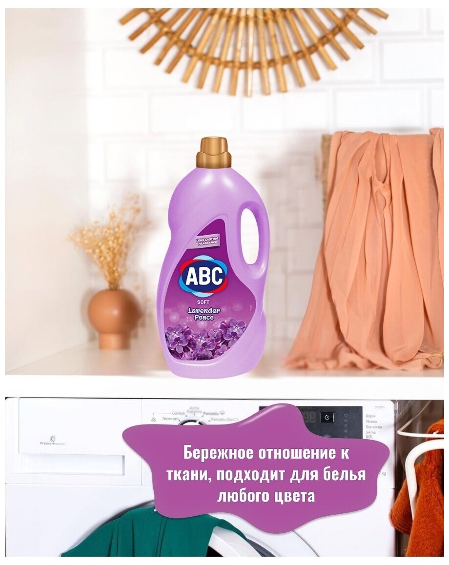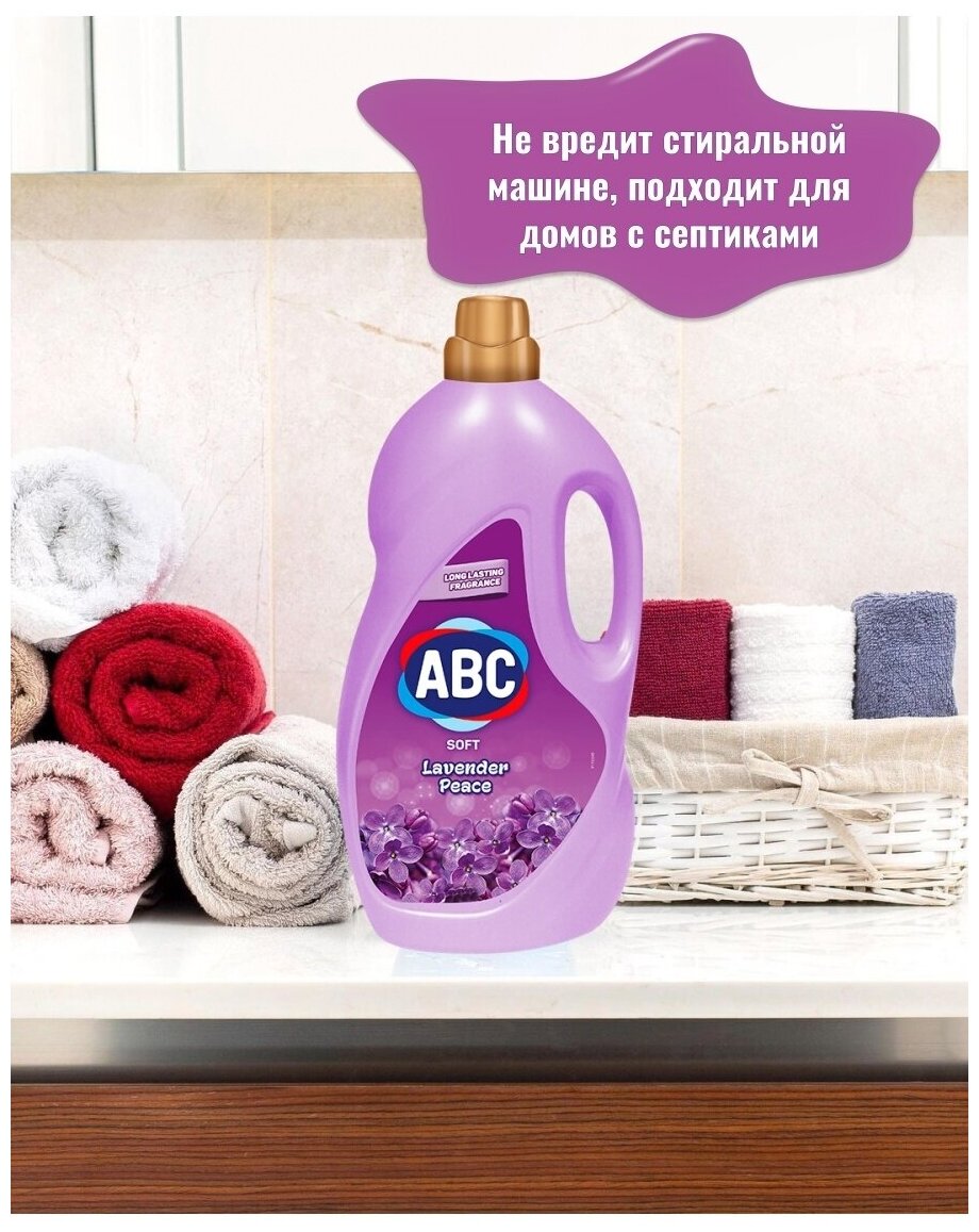 Кондиционер для белья "ABC Лавандовый Мир" - это идеальное средство для ухода за бельем. Благодаря концентрированному составу вы сможете использовать его для стирки большого количества белья. Кондиционер придаст белью мягкость, а также устранит неприятные запахи и сделает его легче глажки. Аромат лаванды наполнит ваш дом приятным благоуханием, создавая атмосферу уюта и комфорта."ABC Лавандовый Мир" подходит для хлопка, шерсти, шелка, синтетики и деликатных тканей. Используйте его для стирки белья любого цвета и типа, включая спортивную одежду, пуховики и детское белье. Он не содержит вредных для здоровья веществ, таких как формальдегид, хлоро, сульфаты и парабены, что делает его безопасным для использования.Способ применения очень прост: добавьте кондиционер в воду при последней стирке и наслаждайтесь результатом. С "ABC Лаванда" ваша одежда будет выглядеть идеально!