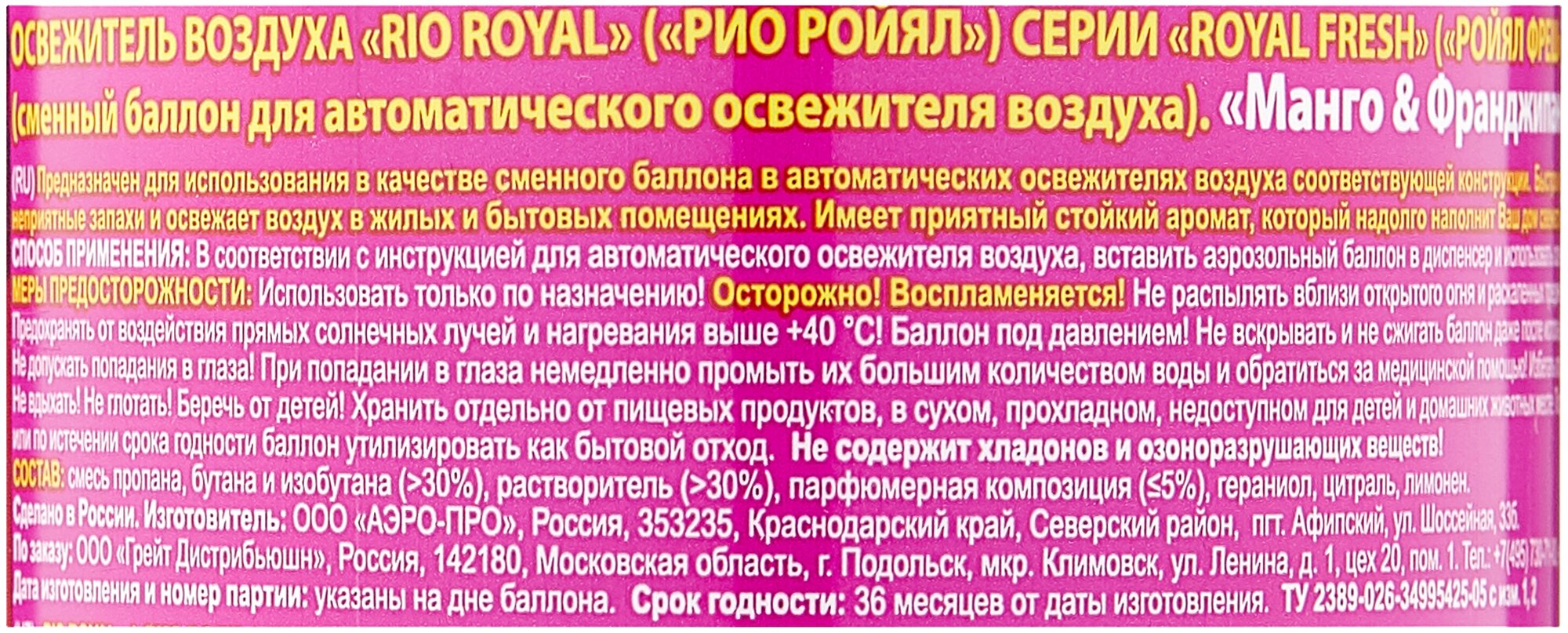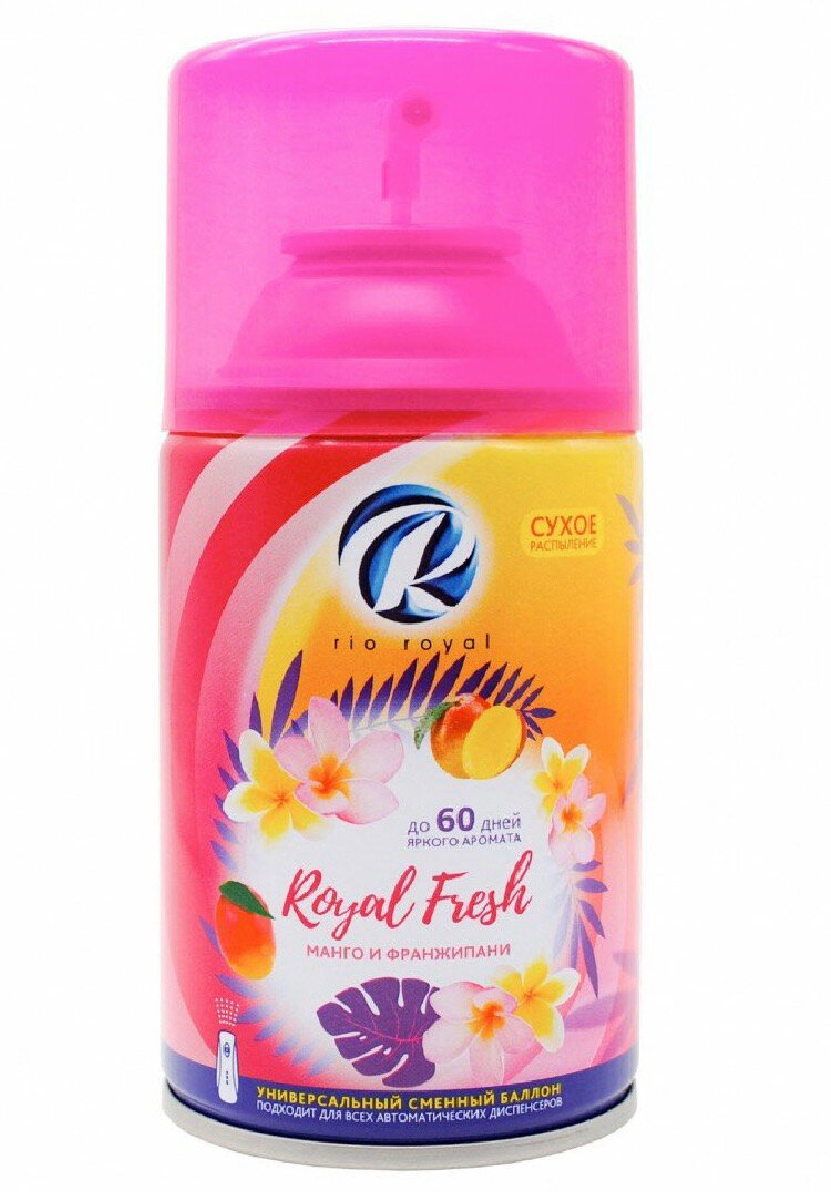 Сменный баллон для автоматического освежителя воздуха Rio Royal "Манго & Франджипани" - это эффективное решение для создания приятной атмосферы в вашем доме.Быстро и эффективно устраняет неприятные запахи и освежает воздух в жилых и бытовых помещениях.Имеет приятный стойкий аромат манго и франджипани, который надолго наполнит ваш дом свежестью и уютом.В соответствии с инструкцией для автоматического освежителя воздуха, вставьте аэрозольный баллон в диспенсер и используйте освежитель по назначению.Меры предосторожности: использовать только по назначению, избегать попадания в глаза, беречь от детей, хранить отдельно от пищевых продуктов, в сухом, прохладном, недоступном для детей и домашних животных месте.После использования или по истечении срока годности баллон утилизировать как бытовой отход.Не содержит хладонов и озоноразрушающих веществ.Состав: смесь пропана, бутана и изобутана (>30%), растворитель (>30%), парфюмерная композиция (≤5%), гераниол, цитраль, лимонен.Вес: 0.23 кг.Объем: 250 мл.Аромат: фруктовый.Количество упаковок: 1.Форма выпуска: аэрозоль.Принцип работы: автоматический.Максимальный срок действия: 60 дней.Выбирая сменный баллон для автоматического освежителя воздуха Rio Royal "Манго & Франджипани", вы получаете эффективное решение для создания приятной атмосферы в вашем доме и заботы о здоровье вашей семьи.