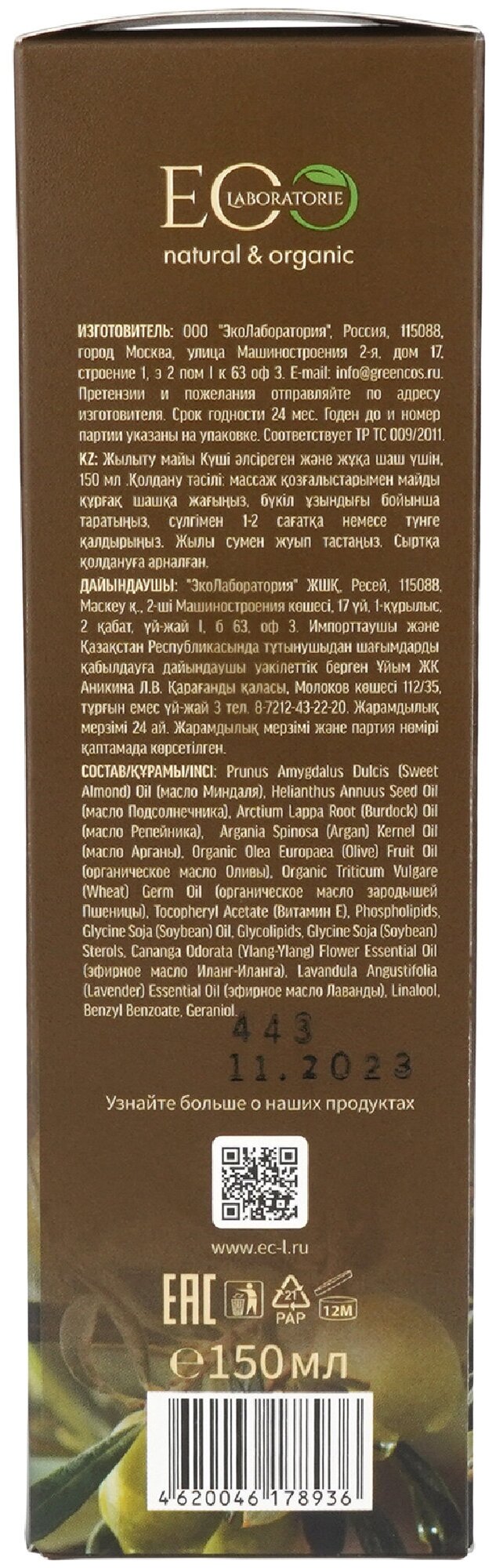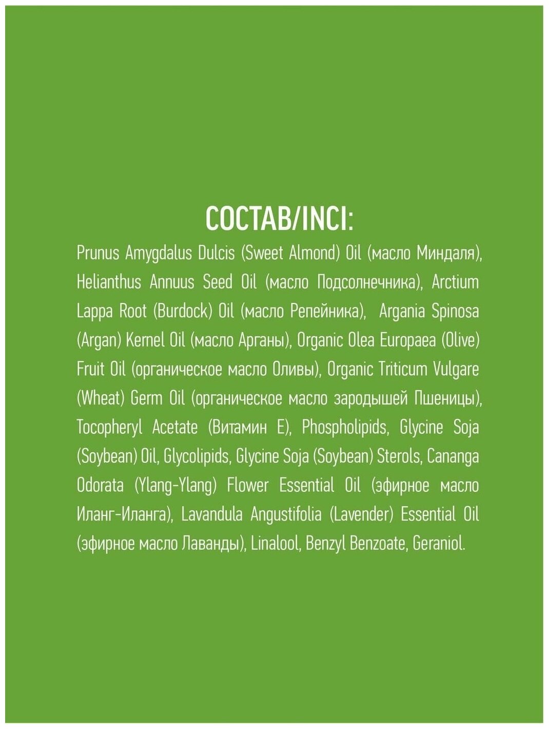 | Химический состав | Prunus Amygdalus Dulcis (Sweet Almond) Oil, Helianthus Annuus Seed Oil, Arctium Lappa Root (Burdock) Oil, Argania Spinosa (Argan). |