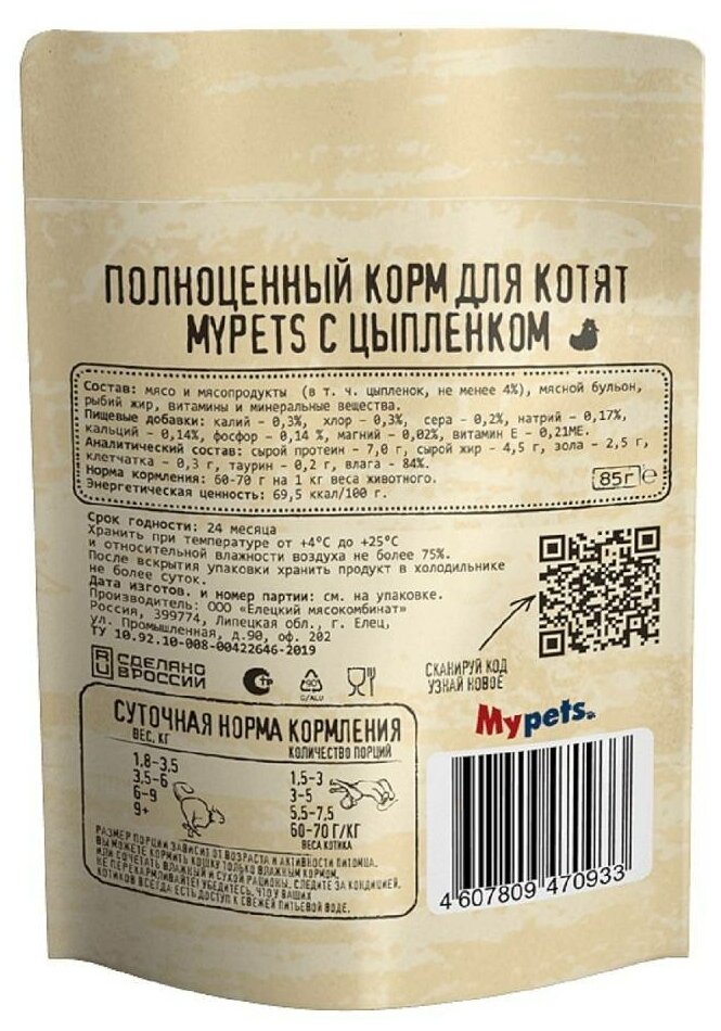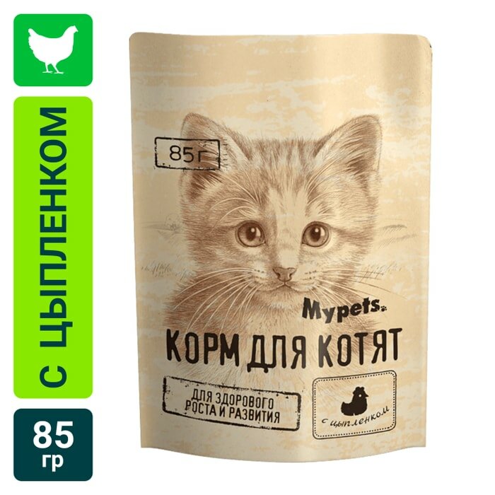 Влажный корм для котят Mypets полноценный с цыпленком 85г Елецкий мясокомбинат