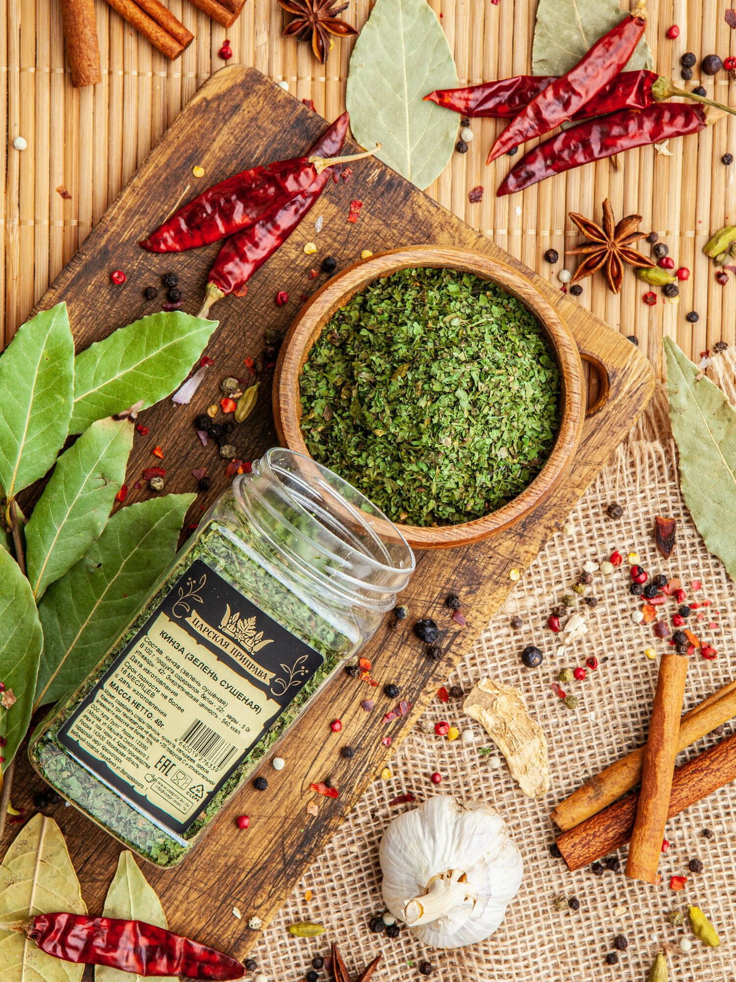 Кинза – пряно-ароматическое зеленое растение (кориандр – его семена). Листья кинзы обладают специфическим резким ароматом и вкусом, именно их используют в кулинарии как пряность. В составе кинзы – эфирные и жирные масла, пектин, белки, аскорбиновая кислота, каротин. Кинза улучшает мозговую активность, стимулирует работу сердца, выводит токсины из крови, очищает печень, устраняет мышечные спазмы, обладает выраженным противоопухолевым действием.В мясные и куриные супы добавляется небольшая щепотка сушеной кинзы для придания густого, насыщенного аромата. Сушеную заготовку вводят во вторые блюда из говядины и баранины, шашлык в конце приготовления либо заправляют соусы и подливы. Долму, люля-кебаб и хачапури невозможно представить без аромата кинзы.