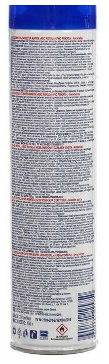 Освежитель воздуха сухое распыление RIO ROYAL "Антитабак" предназначен для устранения неприятных запахов в различных помещениях. Средство действует как нейтрализатор запаха табачного дыма — позволит быстро избавиться от неприятного запаха табака в любом уголке вашего дома.Освежитель воздуха оставит за собой едва уловимый шлейф аромата с приятными цветочными нотками. Универсальный нейтрализатор запаха табака спрей идеально подойдет как для комнаты, так и для туалета, ванной и автомобиля. применение: хорошо встряхнуть освежитель воздуха в туалет и в комнату, затем нажатием на клапан в течение нескольких секунд распылить его содержимое вверх в центре помещения. Внимание: при распылении следует избегать попадания освежителя на стены и на предметы интерьера. меры предосторожности: - использовать только по назначению- не протыкать и не сжигать баллон- беречь от прямых солнечных лучей- не курить во время использования- после использования утилизировать как бытовой отходRIO ROYAL — это эффективная бытовая химия для вашего дома. Средства для дома RIO ROYAL станут незаменимым помощником при уборке и помогут создать в доме атмосферу чистоты и уюта."трансатлантик интернейшнл" — эксклюзивный дистрибьютор RIO ROYAL в России. Нажмите на название "трансатлантик интернейшнл", чтобы ознакомиться с широким ассортиментом хозяйственных товаров RIO ROYAL.