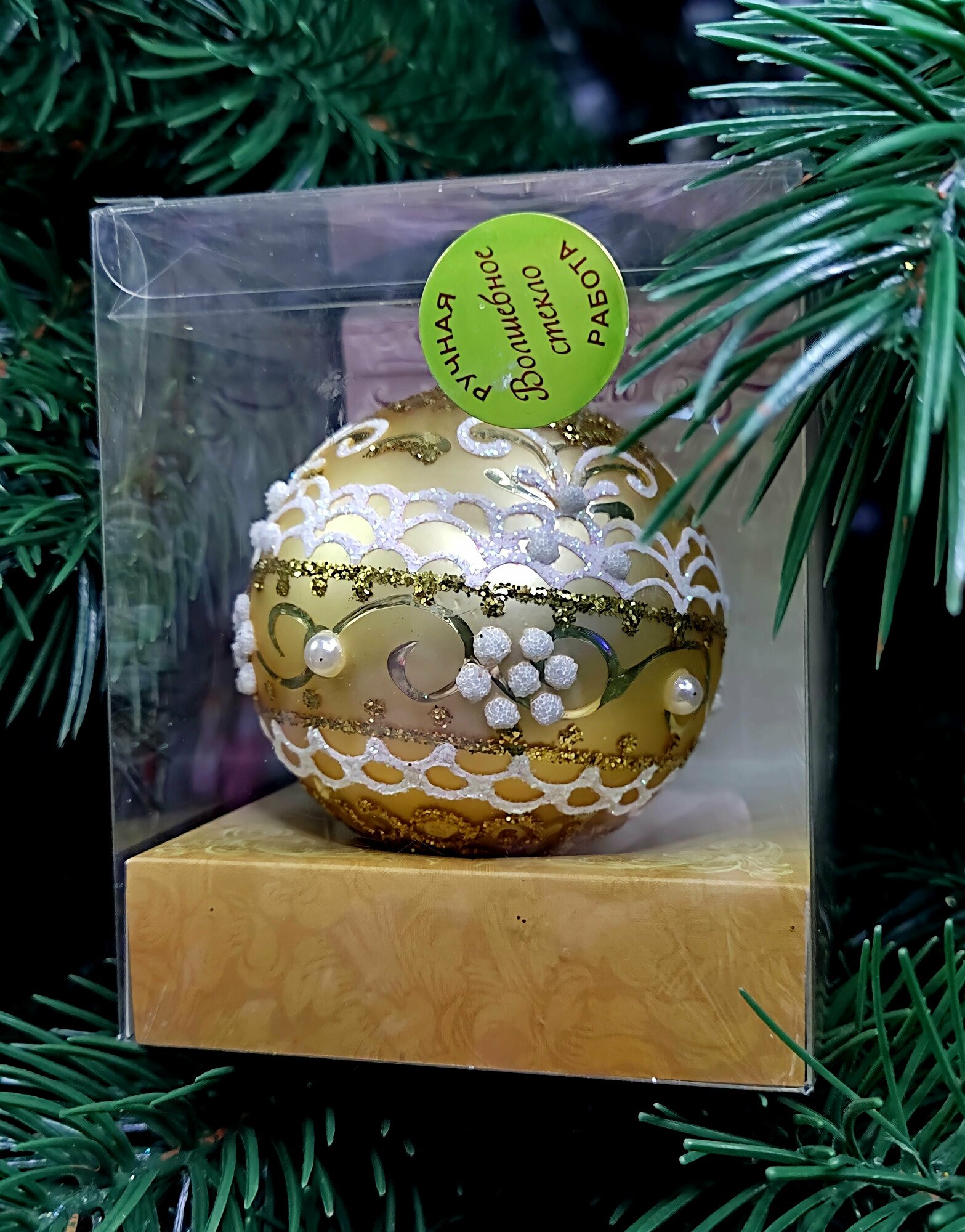 Стеклянный елочный шар расписан вручную, что делает его уникальным. А упакованный в подарочную коробку, он станет приятным новогодним сувениром. Великолепие елочных украшений коллекции «Волшебное стекло» поразит удивительными красками, блестящими стразами, сверкающей бисерной присыпкой и уникальными дизайнами. Серии из шаров и верхушек помогут с легкостью создать роскошный стиль вашего интерьера и новогодней елки. Каждое изделие расписывается художником вручную, что делает их поистине уникальными. Такой новогодний сувенир станет памятным подарком и особенным знаком внимания.