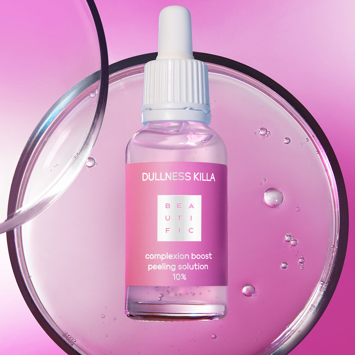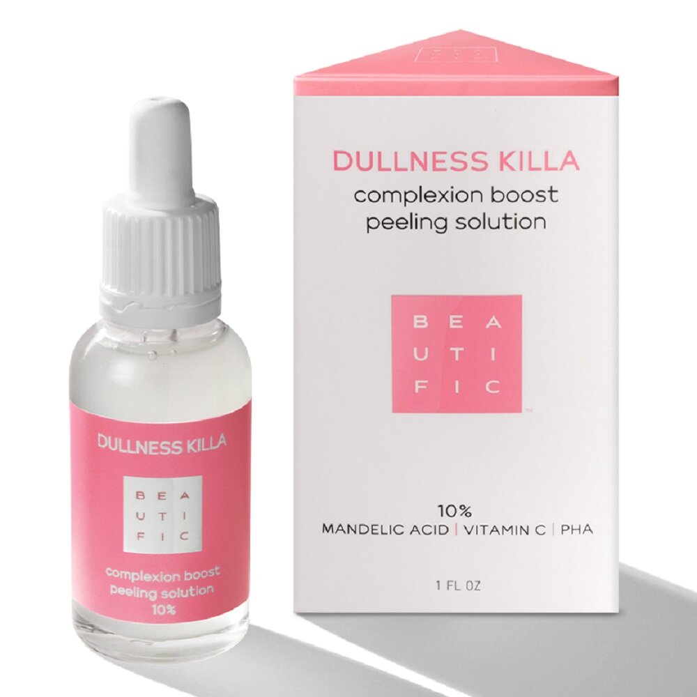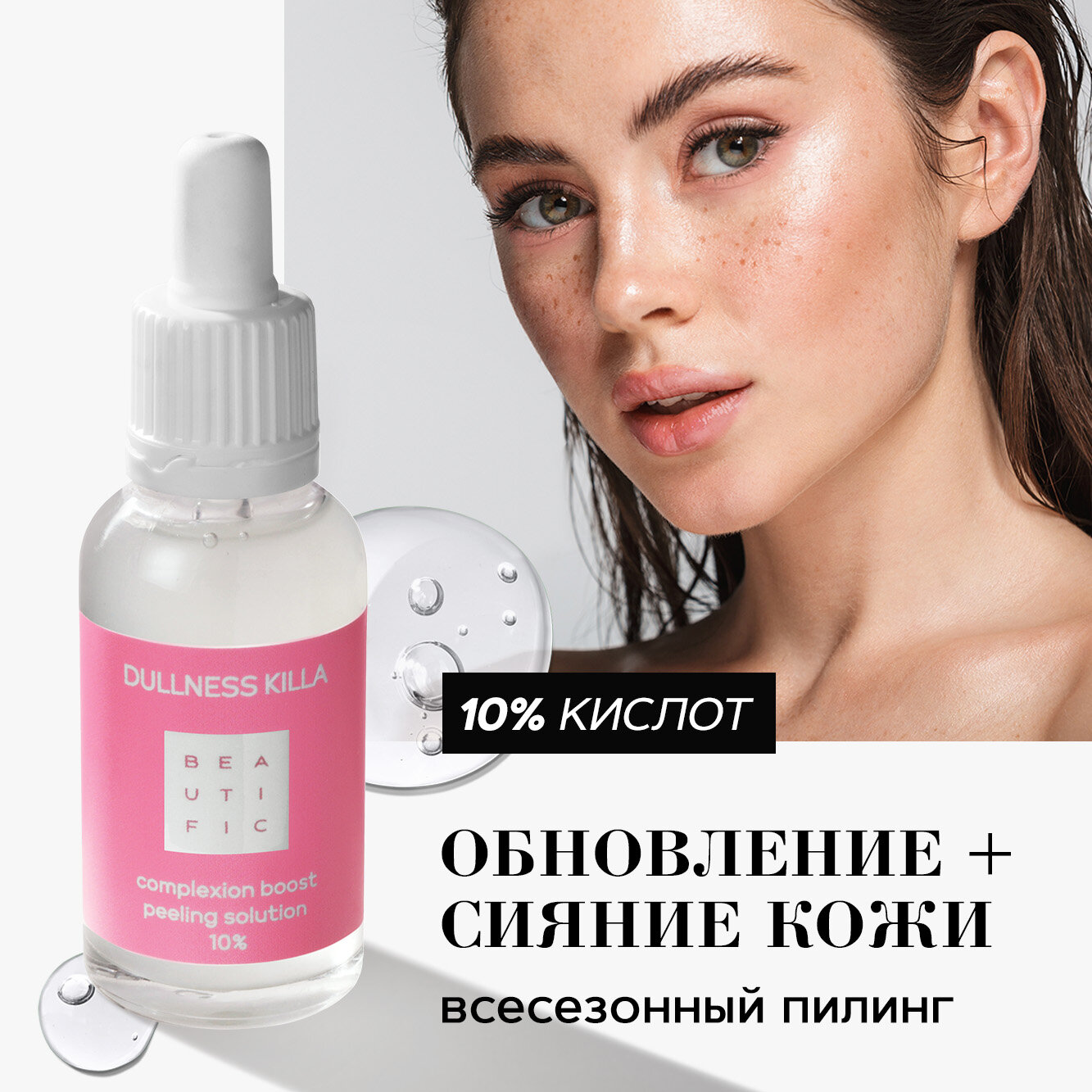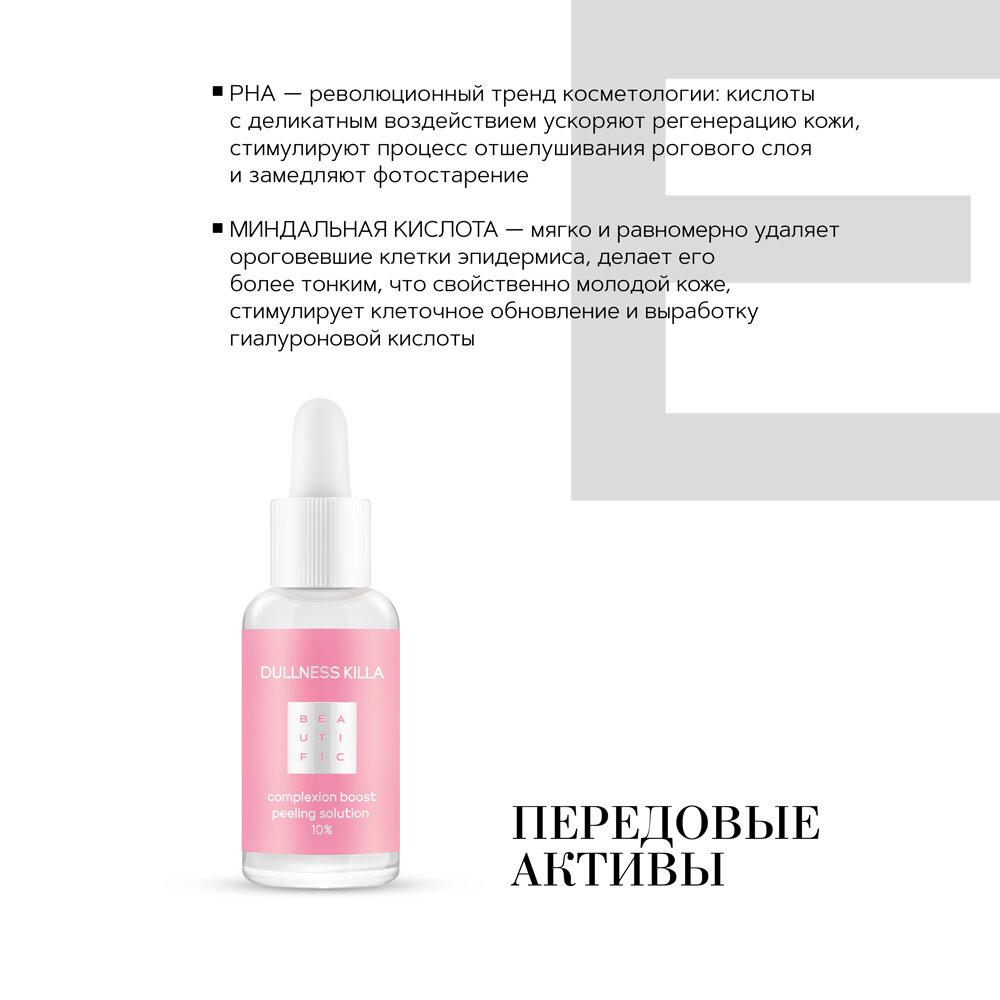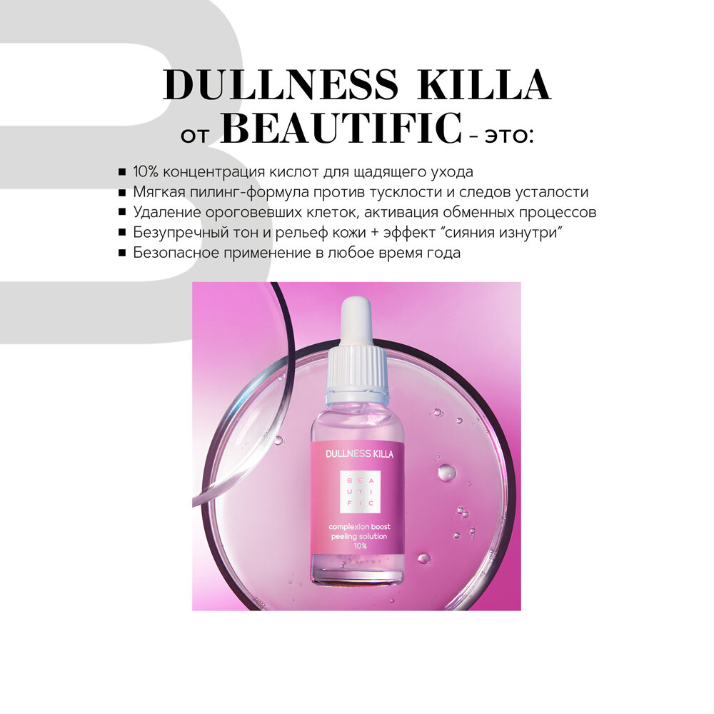 Встречай инновационный всесезонный кислотный пилинг DULLNESS KILLA от Beautific, который станет главным обновляющим средством в твоем бьюти-арсенале! Мягкая формула пилинга содержит только 10% концентрацию кислот для бережного, но эффективного пилинга даже в летнее и зимнее время. Средство отлично помогает от акне и от пигментации, а также обеспечивает более ровный тон, безупречную мягкость, ультра-чистоту без пересушивания и агрессивного воздействия на кожу. Рельеф кожи становится безупречно гладким, благодаря чему твой макияж держится дольше и выглядит просто сногсшибательно. Вечеринка, съемка, свидание - твоя кожа готова ко всему! Миндальная кислота в составе пилинга отвечает за деликатное отшелушивание и обновление кожи, а также визуально сужает поры и стимулирует выработку коллагена и эластина, делая кожу более гладкой и нежной. PHA кислоты (глюконолактон и лактобионовая кислота) ускоряют восстановление кожи, деликатно обновляют ее и защищают от вредного УФ воздействия.Способ примененияравномерно нанеси средство на предварительно очищенную кожу лица и шеи. Избегай зоны вокруг глаз и губ. Оставь на 7-10 минут, затем тщательно смой теплой водой. Не используй дольше 10 минут. Внимание: возможна индивидуальная непереносимость компонентов. Перед применением протестируйте на небольшом участке кожи. Используйте только по назначению. Не используйте на поврежденных участках кожи. Избегайте зоны вокруг глаз. В случае попадания в глаза, промойте большим количеством воды. Наносите крем SPF во период использования пилинга.