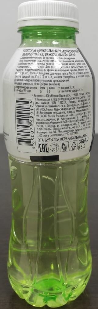 | Состав | Очищенная вода, сахар, экстракт зеленого чая, яблочный сок, антиокислитель – аскорбиновая кислота, регуляторы кислотности: лимонная кислота, цитрат натрия 3-замещенный, ароматизаторы. |