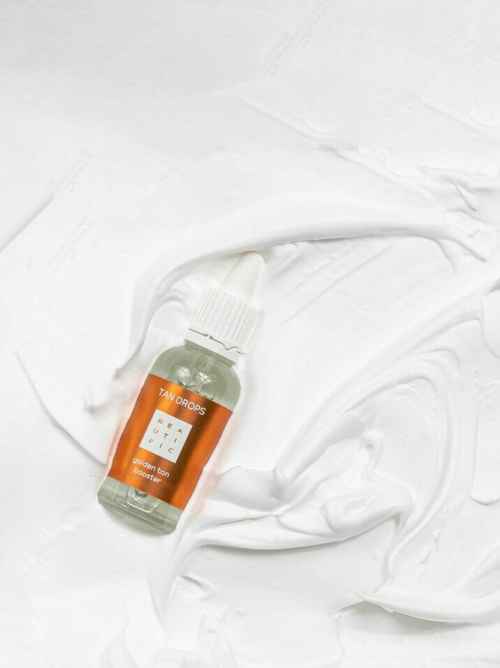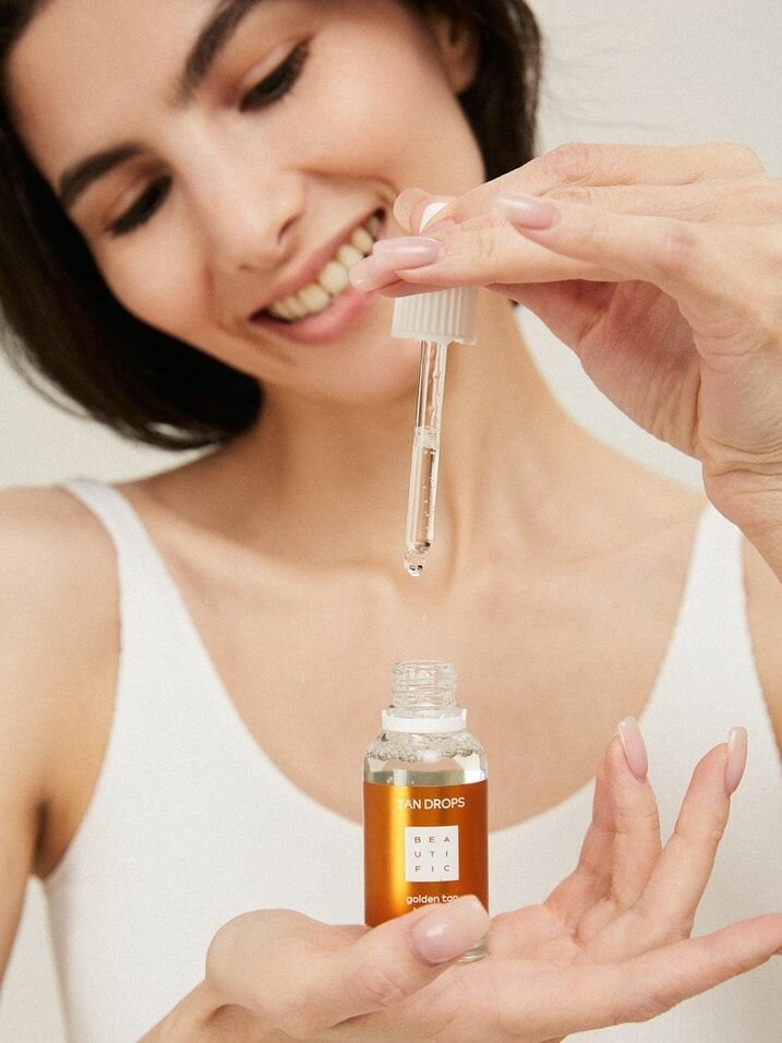 Капли-концентрат автозагар Beautific Tan Drops для любого типа кожи. Выравнивают тон и увлажняют. Равномерно распределяются тонким слоем. Быстро впитываются, не оставляют оранжевых пятен и полос. Альтернатива естественному загару — экономит время. Используется с кремом — для более мягкого оттенка. Капли в чистом виде — для более интенсивного цвета. В составе эритрулоза, гиалуроновая кислота и экстракт алоэ — питают и смягчают кожу, не позволяя ей пересыхать. Держится от пяти до десяти дней. Для сохранения результата повторять процедуру 2 — 3 раза в неделю. Можно использовать круглый год. Подходит для лица, области шеи, линии волос и плеч.