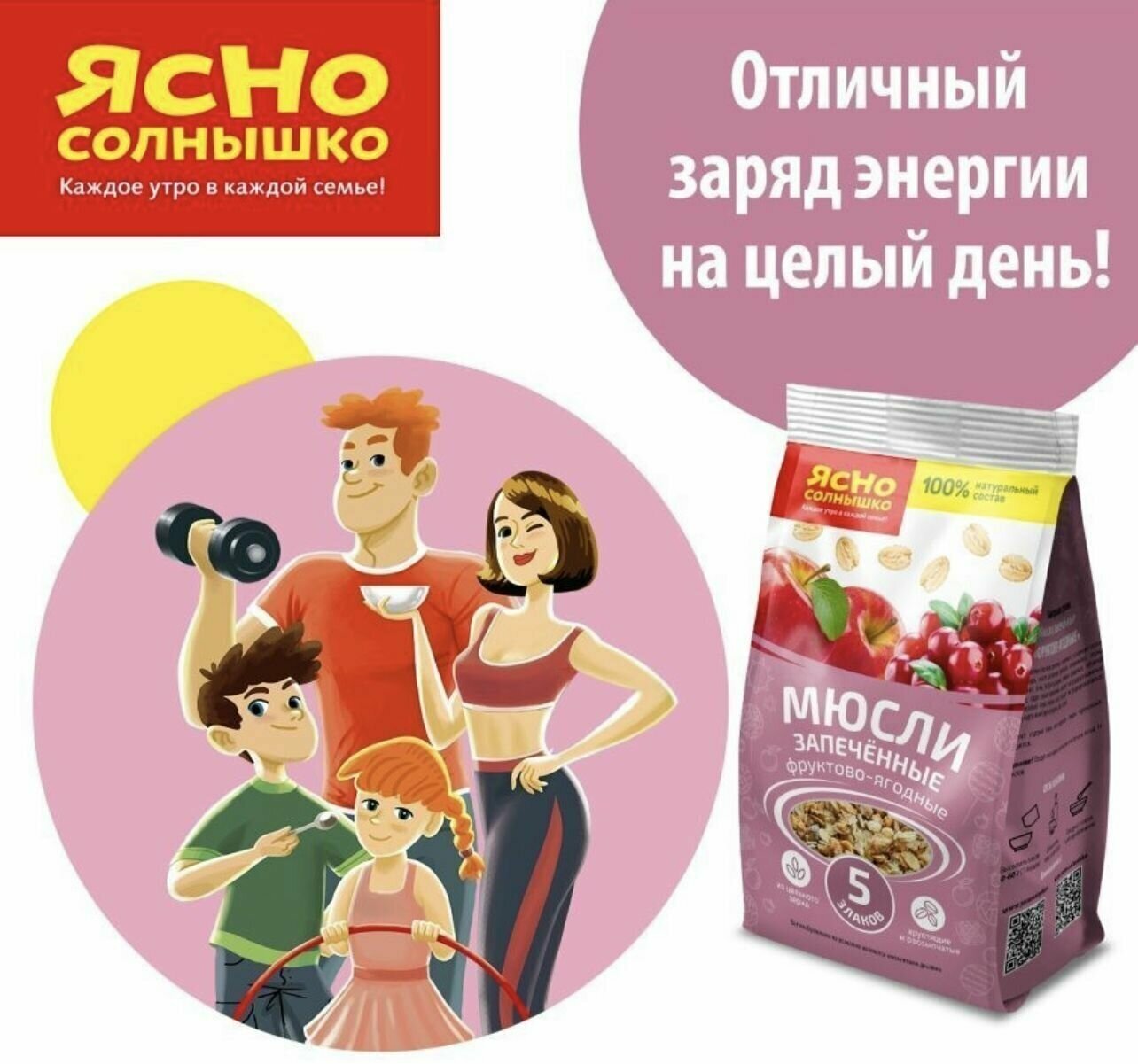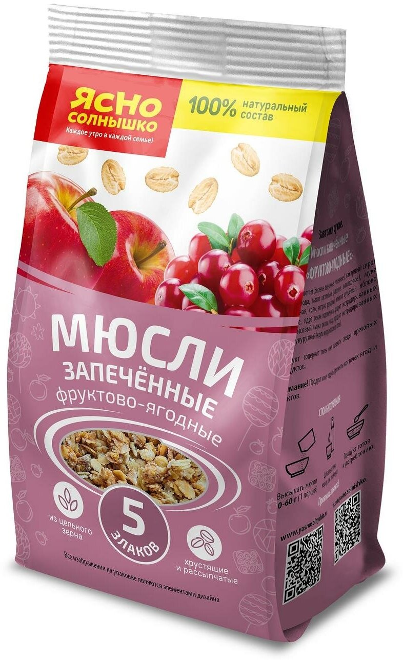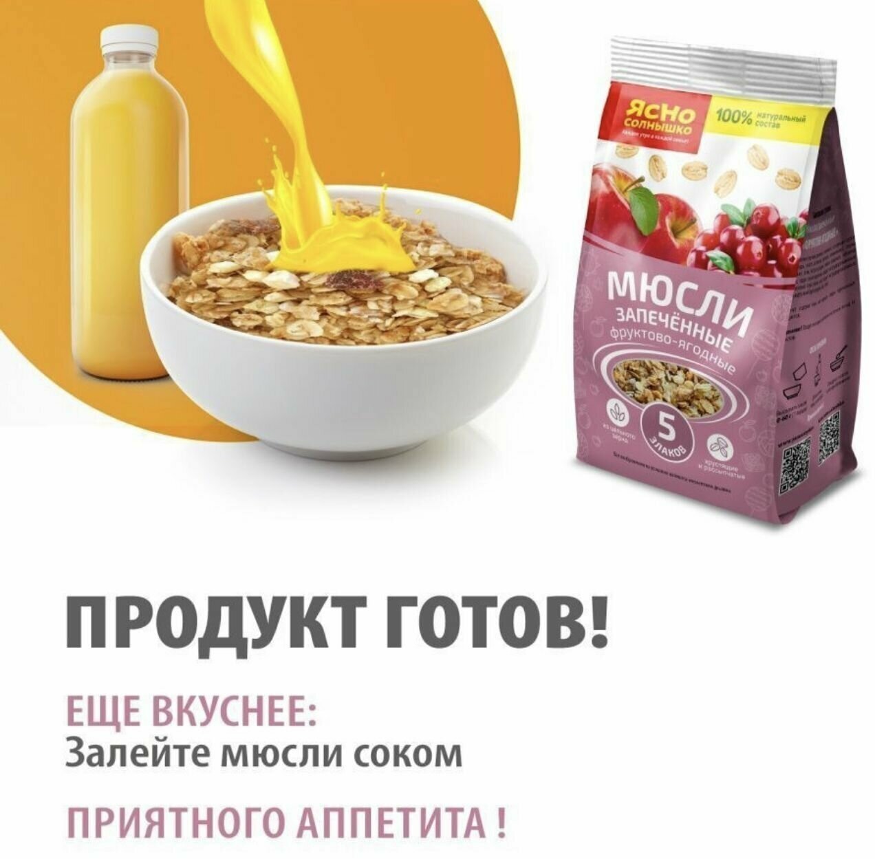 Мюсли Ясно Солнышко фруктово-ягодные - это полностью готовый легкий и вкусный завтрак на Вашем столе. Хрустящие и рассыпчатые хлопья из 5 видов злаков в сочетании с фруктами - вкус и польза от самой природы!