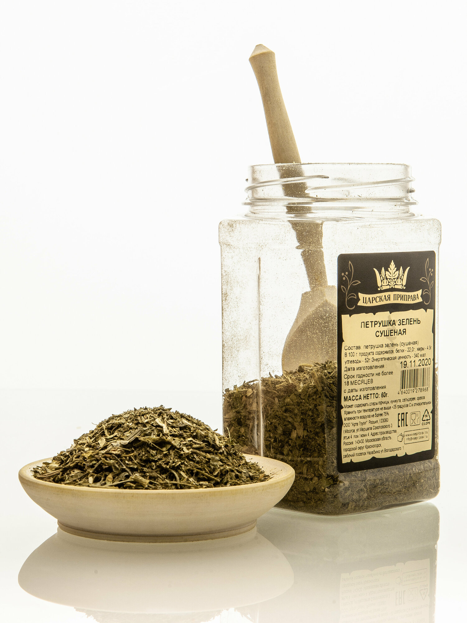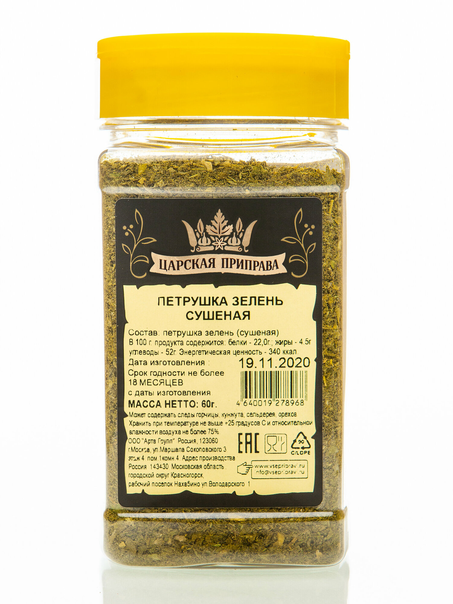Петрушка зелень сушеная натуральная "Царская приправа" - это полезная и ароматная приправа, которая станет незаменимым помощником на вашей кухне. Продукт получен путем высушивания натуральной молодой зелени петрушки, что позволяет сохранить все его ароматические и вкусовые свойства.Продукт упакован в удобную ПЭТ банку с герметичной крышкой и дозатором, что обеспечивает удобство использования и сохранность продукта.Сушеная петрушка обладает богатым витаминным составом, содержит витамин С, каротин, а также обладает антибактериальным эффектом и нормализует работу кишечника.Продукт не содержит искусственных красителей, ароматизаторов, ГМО, глутамата натрия, соли и консервантов, что делает его безопасным для здоровья и подходящим для всех, кто придерживается принципов здорового питания.Петрушка зелень сушеная натуральная "Царская приправа" - это отличный выбор для тех, кто ценит качество, вкус и пользу.