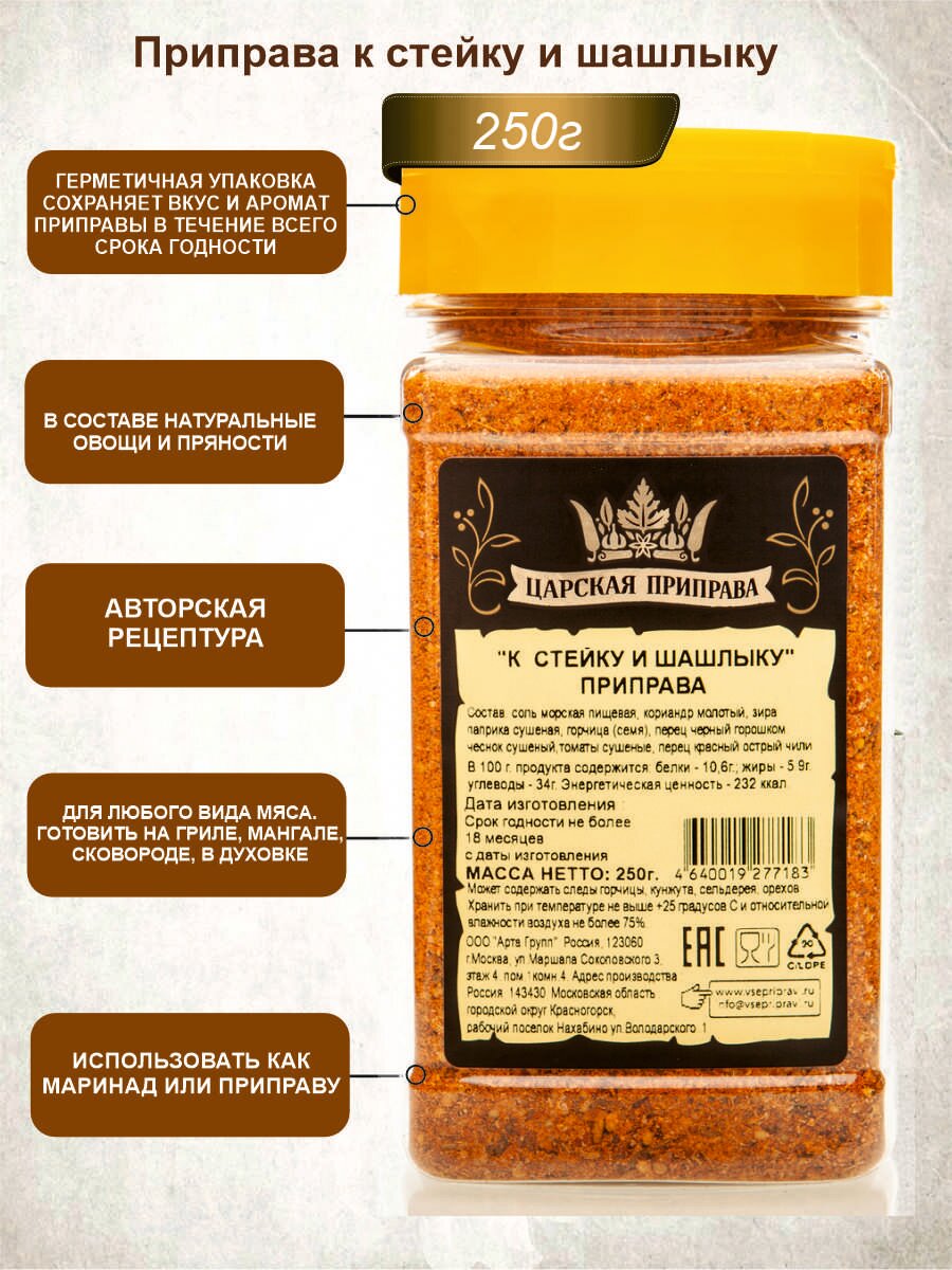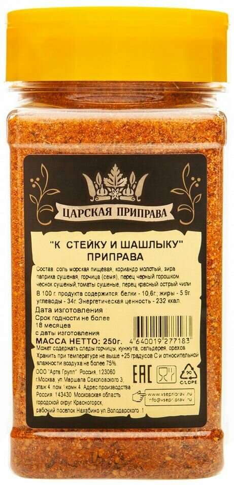 Сервис сравнения цен СкидкаГИД предлагает сравнить цены на товар «Приправа Царская приправа для стейка и шашлыка 250г Арта Групп»