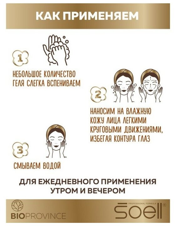 | Способ применения | Вспенить небольшое количество геля, нанести на влажную кожу лица, смыть водой. |