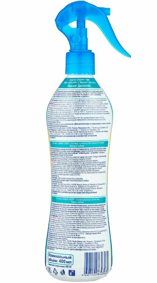 Морское ДыханиеПредназначен для устранения неприятных запахов и ароматизации воздуха в жилых помещениях, в ванных и туалетных комнатах, в салонах автомобилей и т.д. Легко и эффективно освежает воздух, надолго наполняя его приятными стойкими ароматами. Не содержит газов - пропеллентов, что делает его абсолютно безопасным при применении и хранении.