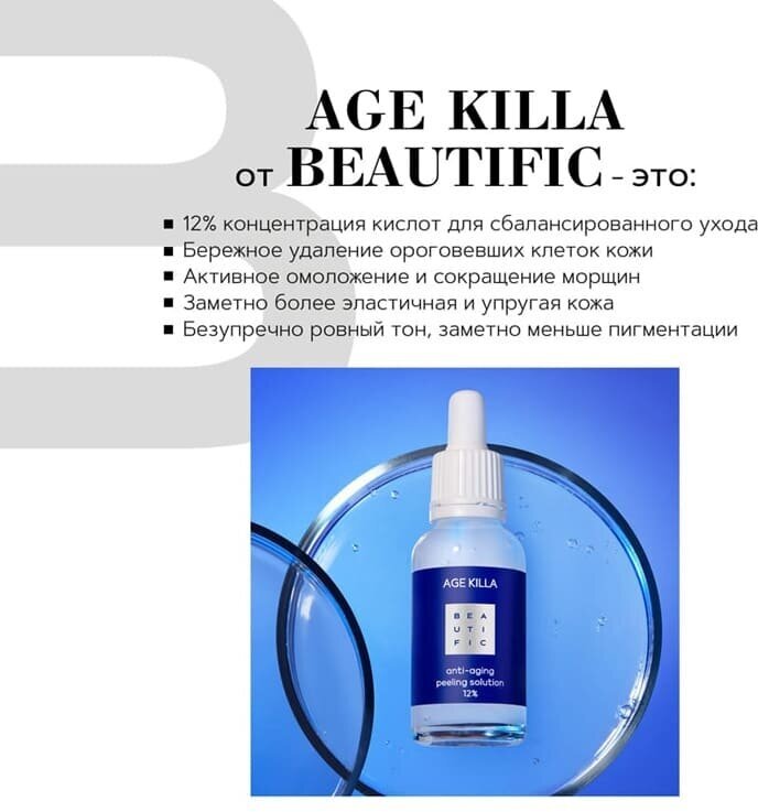 Ты рождена быть совершенной, и даже стрессы большого города или бешеный ритм жизни не скажутся на молодости и красоте твоей кожи! Новый омолаживающий пилинг AGE KILLA от Beautific - это wow-средство с эффектом профессиональной салонной процедуры для абсолютного очищения и омоложения! Эффективная формула с гликолевой кислотой и центеллой азиатской способствует удалению омертвевших клеток эпидермиса и грамотному обновлению кожи с первыми признаками увядания. Результат - активизируется клеточное обновление, кожа начинает активно дышать, повышается эластичность и разглаживаются мелкие морщинки. Разработано без силиконов, парабенов, минеральных масел.