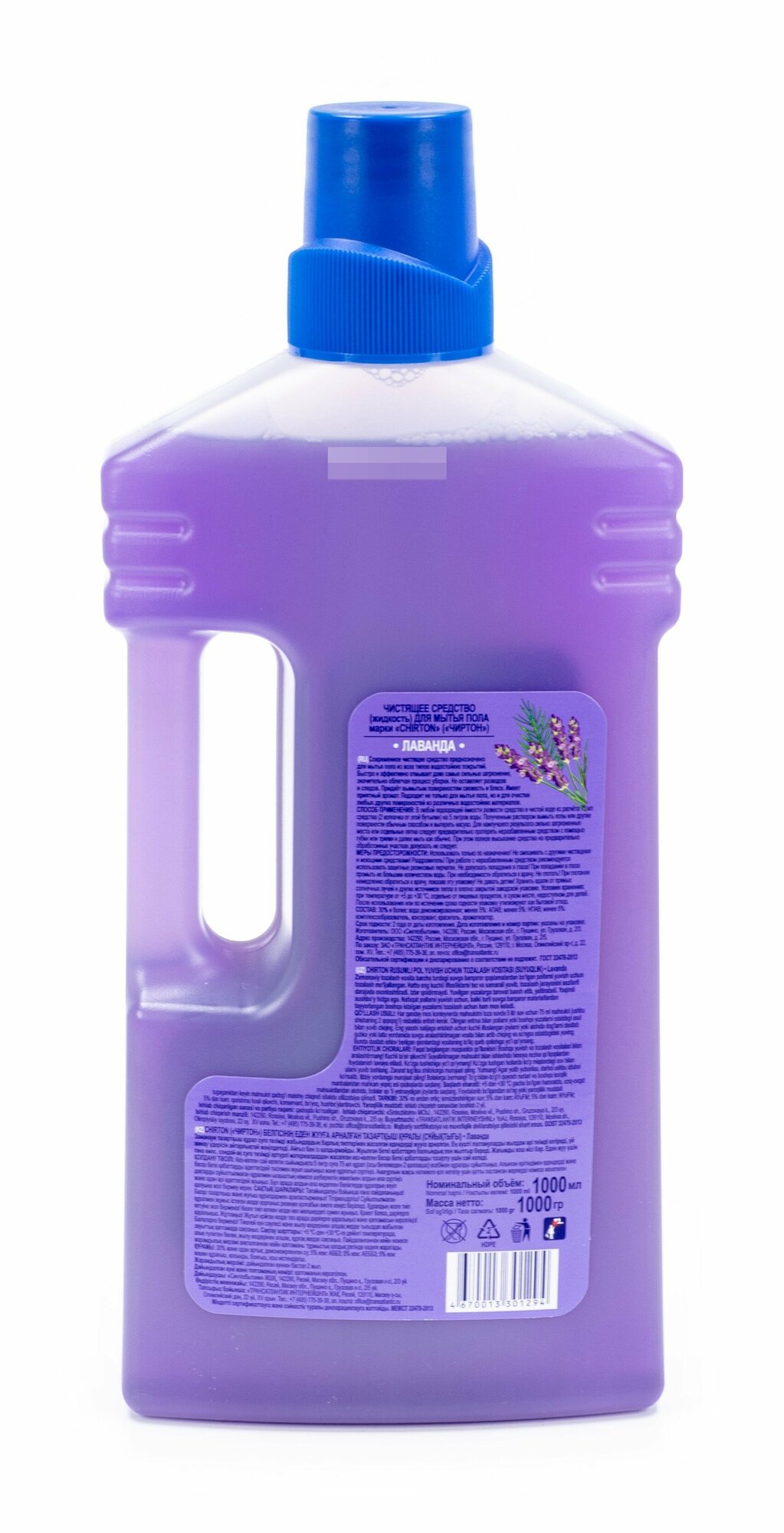 Средство для мытья полов Chirton "Лаванда", 1 л Средство для мытья полов, предназначено для мытья полов из всех типов водостойких покрытий. Быстро и эффективно отмывает даже самые сильные загрязнения, значительно облегчает процесс уборки. Не оставляет разводов и следов. Придает вымытым поверхностям свежесть и блеск. Имеет приятный аромат. Подходят не только для мытья полов, но и для очистки для любых других поверхностей из различных водостойких материалов. Способ применения: в любой подходящей емкости развести средство в чистой воде из расчета 1-2 колпачка на 5 л воды. Полученным раствором вымыть полы или другие поверхности обычным способом и вытереть насухо. Для наилучшего результата сильно загрязненные места или отдельные пятна следует предварительно протереть неразбавленным средством или отдельные пятна следует предварительно протереть неразбавленным средством с помощью губки или тряпки и далее мыть как обычно. При этом полное высыхание средства на предварительных обработанных участках допускать не следует. Меры предосторожности: использовать только по назначению. Не смешивать с другими чистящими и моющими средствами. Раздражитель. При работе с неразбавленным средством рекомендуется использовать защитные резиновые перчатки. Не допускать попадания в глаза. При попадании в глаза промыть их большим количеством воды. При необходимости обратиться к врачу. Не глотать. При глотании немедленно обратиться к врачу, показав эту упаковку. Не давать детям. Хранить вдали т прямых солнечных лучей и других источников тепла в плотно закрытой заводской упаковке. Хранить при температуре + °5 °C до +30 °C отдельно от пищевых продуктов, в сухом прохладном месте, недоступном для детей. Состав: 30% вода очищенная, менее 5% апав, нпав, трилон 6, ароматизатор, краситель. -Вес: 1090 г.