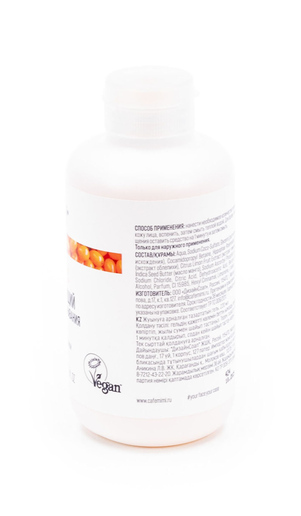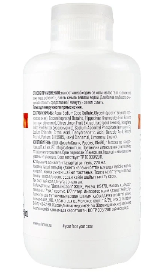 | Состав | Aqua, Sodium Coco-Sulfate, Glycerin (растительного происхождения), Cocamidopropyl Betaine, Hippophae Rhamnoides Fruit Extract (экстракт облепихи), Citrus Limon Fruit Extract (экстракт лимона), Mangifera Indica Seed Butter (масло манго), Sodium Ascorbyl Phosphate (витамин С), Sodium Chloride, Citric Acid, Dehydroacetic Acid, Benzoic Acid, Benzyl Alcohol, Parfum, CI 15985, Hexyl Cinnamal, Limonene, Linalool |