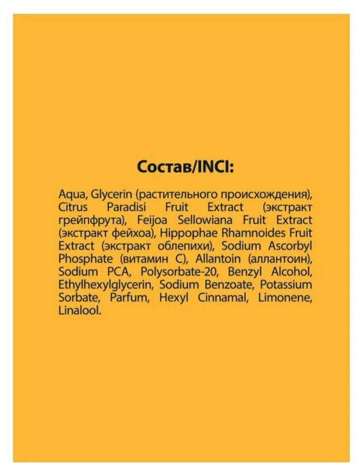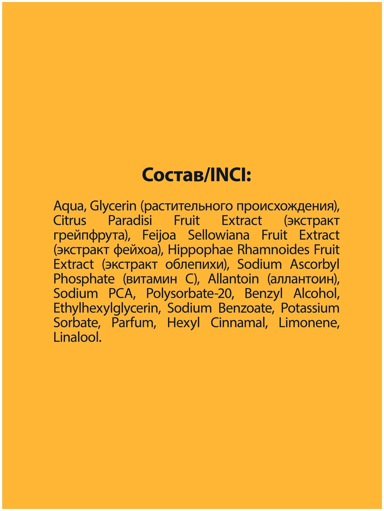 | Состав | aqua, glycerin (растительного происхождения), citrus paradisi fruit extract (экстракт грейпфрута), feijoa sellowiana fruit extract (экстракт фейхоа), hippohae rhamnoides fruit extract (экстракт облепихи), sodium ascorbyl phospate (витамин с), allantoin (аллантоин), sodium pca, polysorbate-20, benzyl alcohol, ethylhexylglycerin, sodium benzoate, potassium sorbate, parfum, hexyl cinnamal, limonene, linalool |