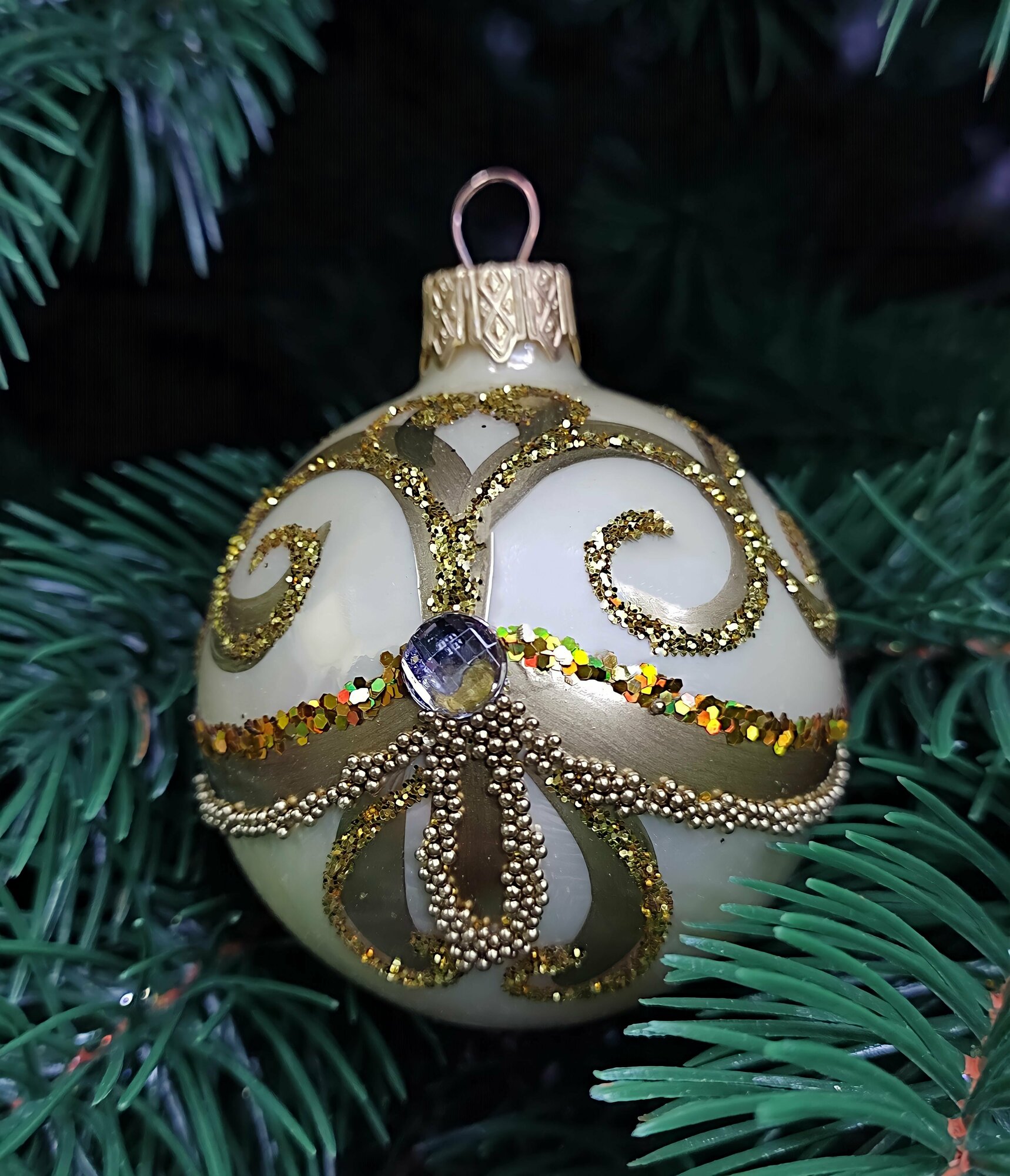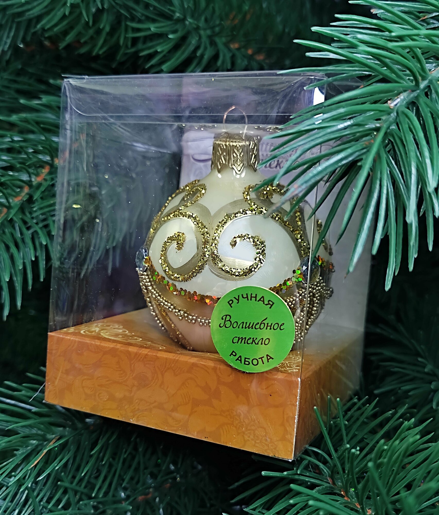 Шар, изготовленный из стекла, заметно преображается в окружении гирлянд и яркой мишуры. Размер 65 мм позволяет ему органично соседствовать с другими елочными игрушками. Товар произведен в России.