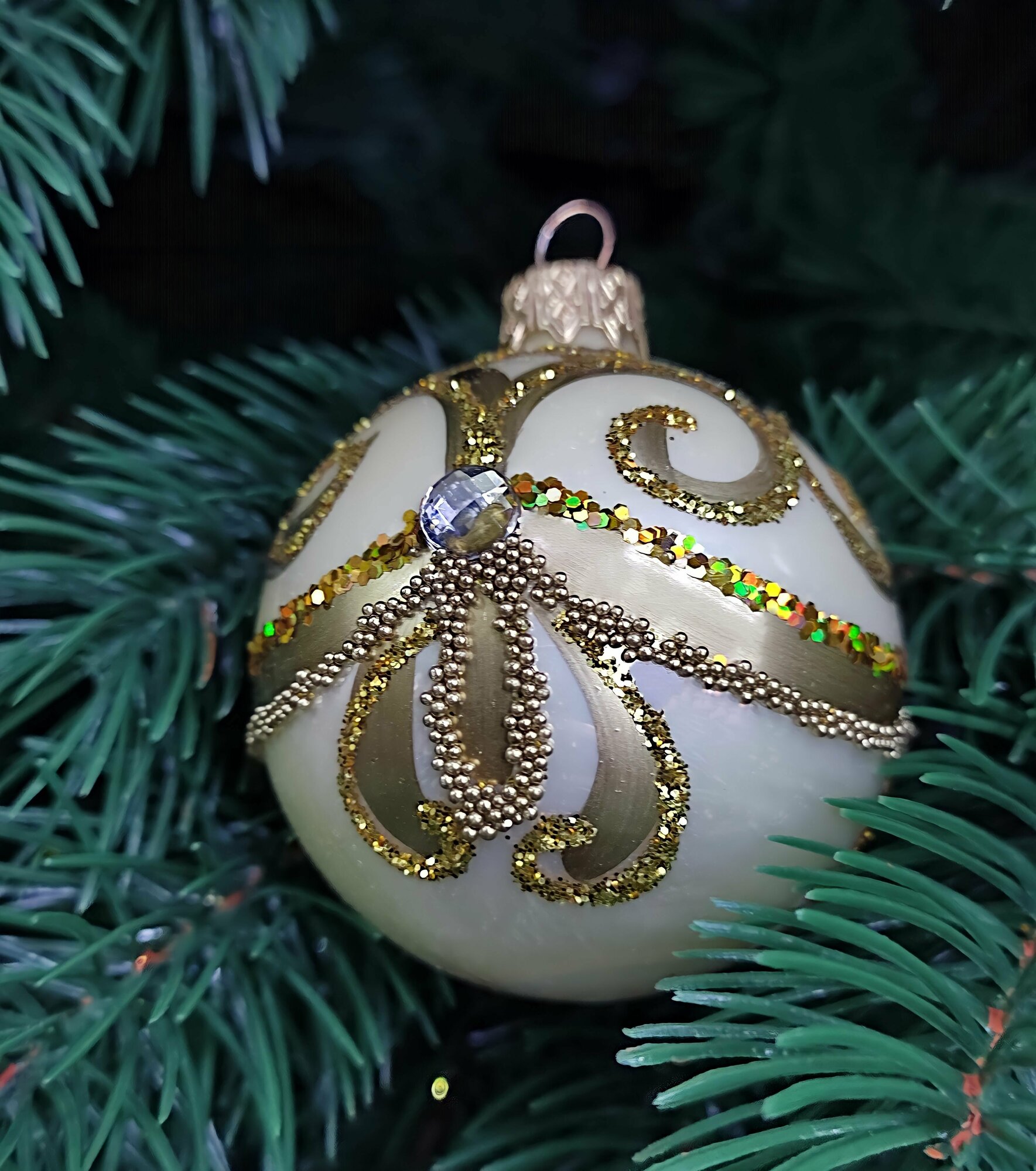 **Шар ёлочный «Дивный»** станет ярким украшением новогоднего дерева. Может использоваться в качестве элемента новогоднего декора. Игрушка оформлена блёстками. Благодаря изящному узору выглядит элегантно и воздушно.