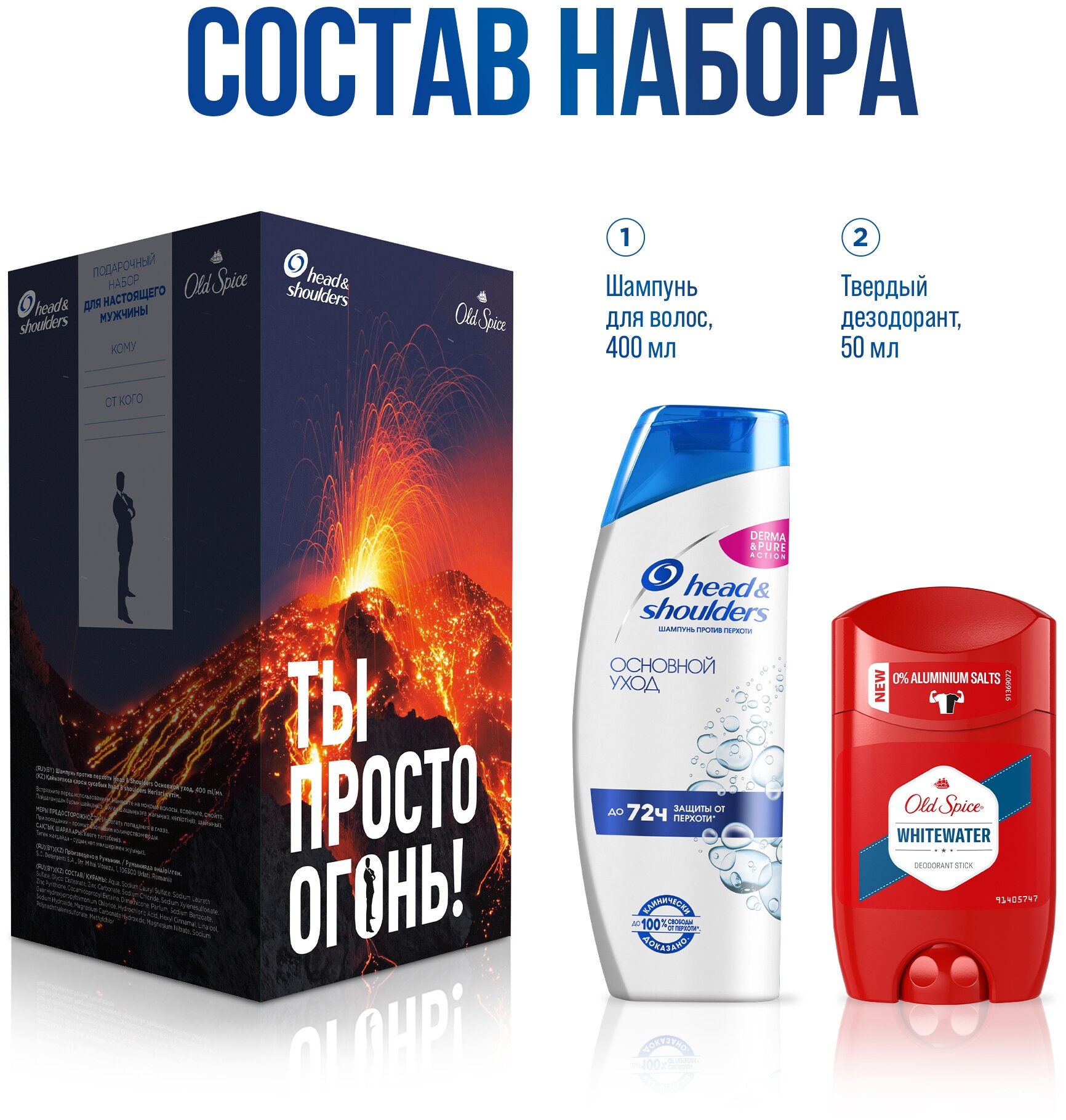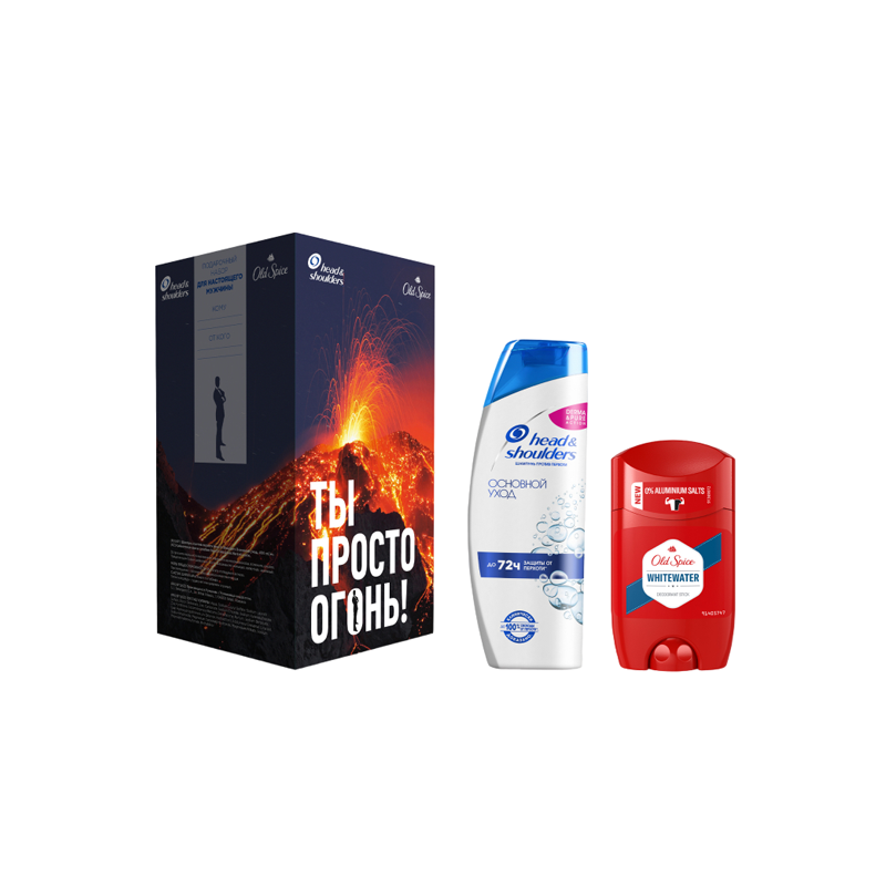 Вулканический заряд энергии! Мужской набор "Ты просто огонь!" для настоящего мужчины от Head & Shoulders (Хед энд Шолдерс) и Old Spice (Олд Спайс) - всё, что нужно для активных и спортивных мужчин. Шампунь Head & Shoulders Sport Основной уход 400мл бережно очищает кожу головы и волосы, увлажняя их и придавая им ощущение свежести. Твердый дезодорант Old Spice Whitewater 50мл - мужская классика с нотами лимона и уверенности в себе. Подарите мужчине роскошный аромат и стойкую свежесть и раскройте в нем дух приключений вместе с Head & Shoulders и Old Spice!