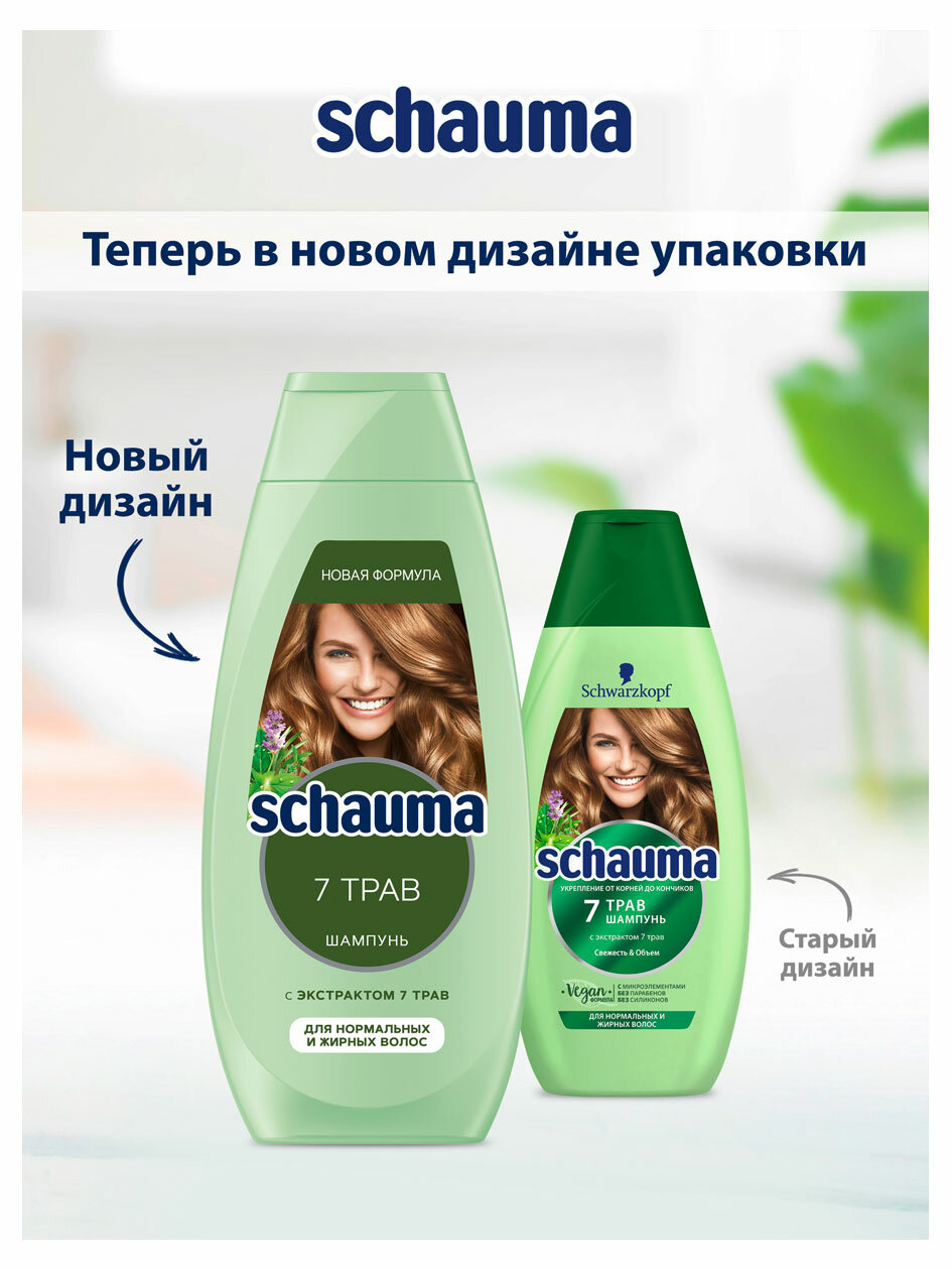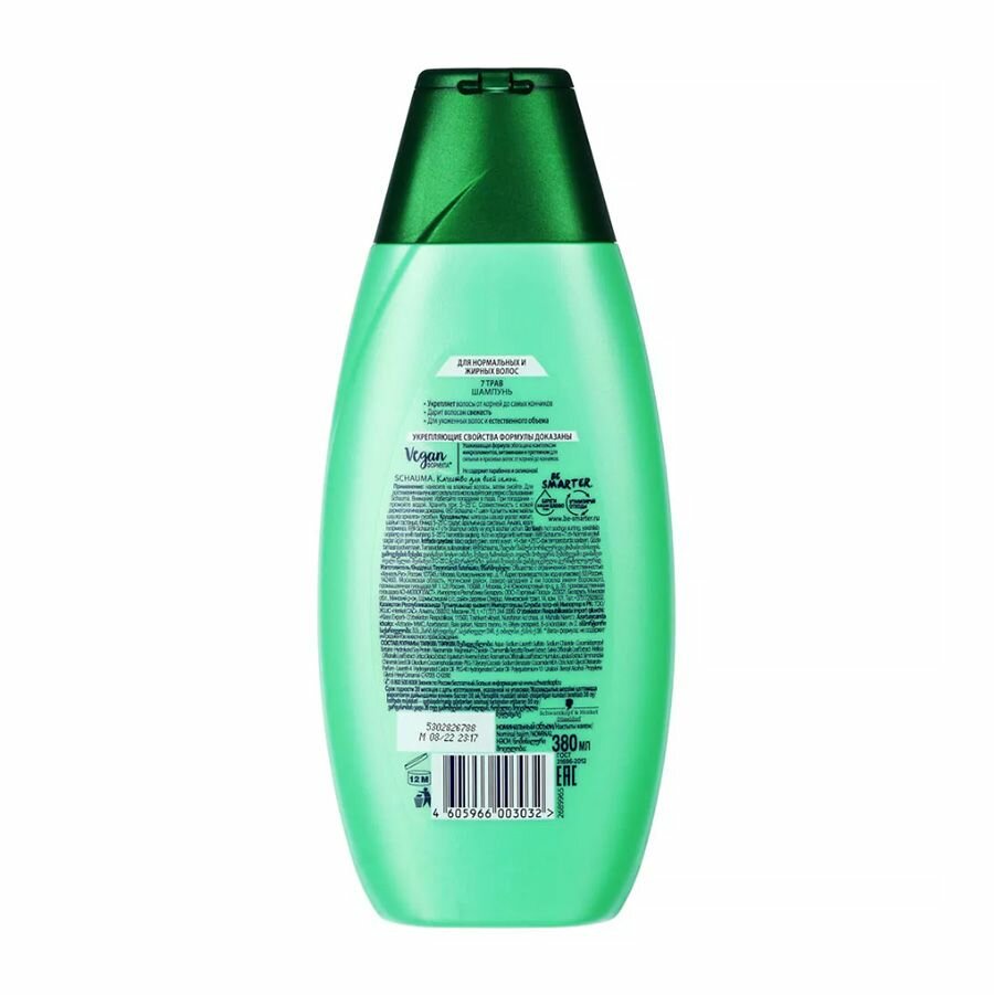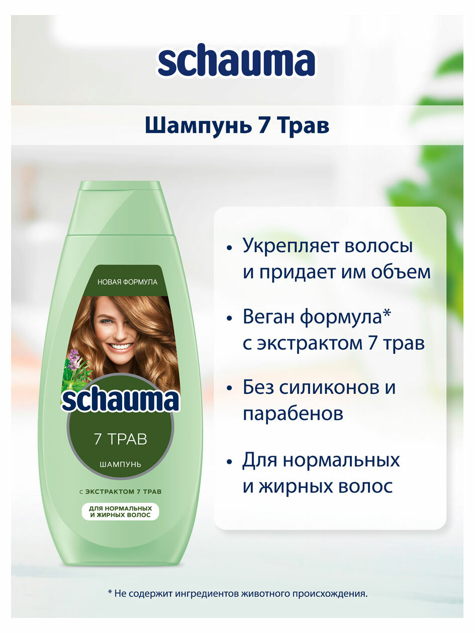 SCHAUMA 360 мл Шампунь 7 Трав для нормальных и жирных волос.• Укрепляет волосы.• Придает волосам свежесть и естественный объем.• Веган формула*, без силиконов и парабенов.*Не содержит ингредиентов животного происхождения.