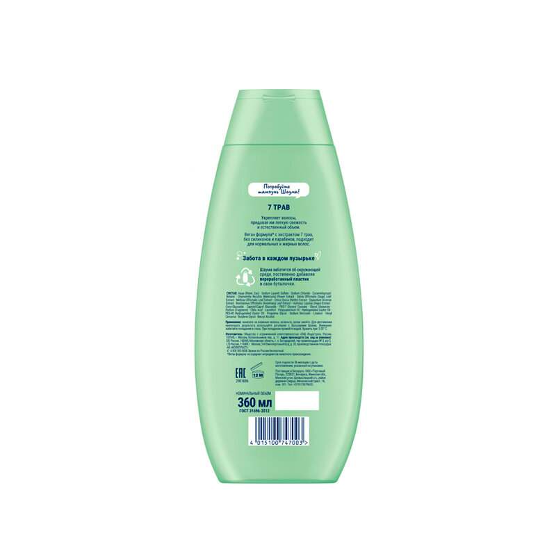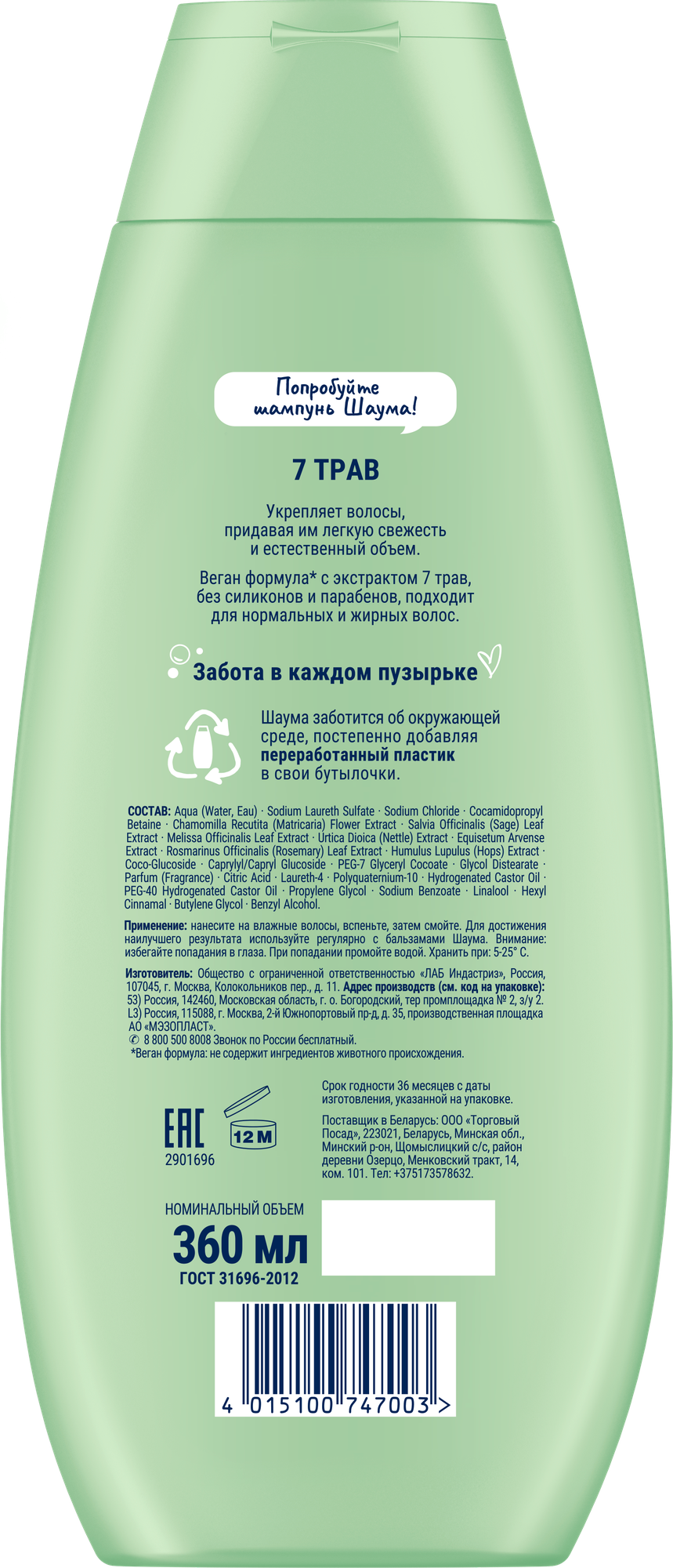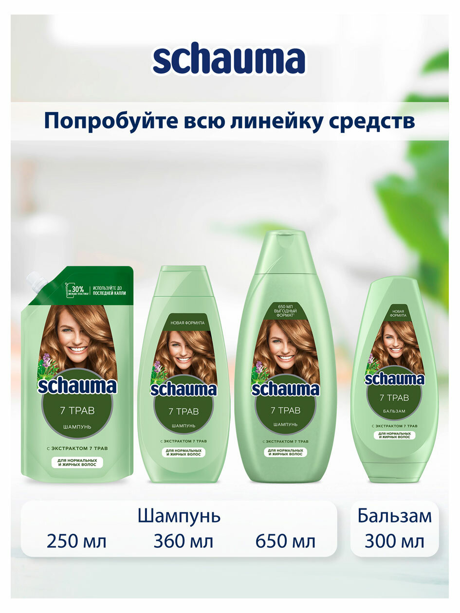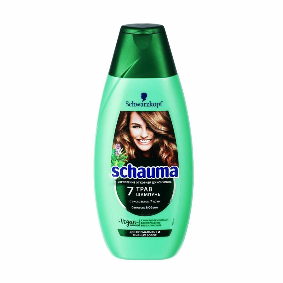 SCHAUMA 360 мл Шампунь 7 Трав для нормальных и жирных волос.• Укрепляет волосы.• Придает волосам свежесть и естественный объем.• Веган формула*, без силиконов и парабенов.*Не содержит ингредиентов животного происхождения.